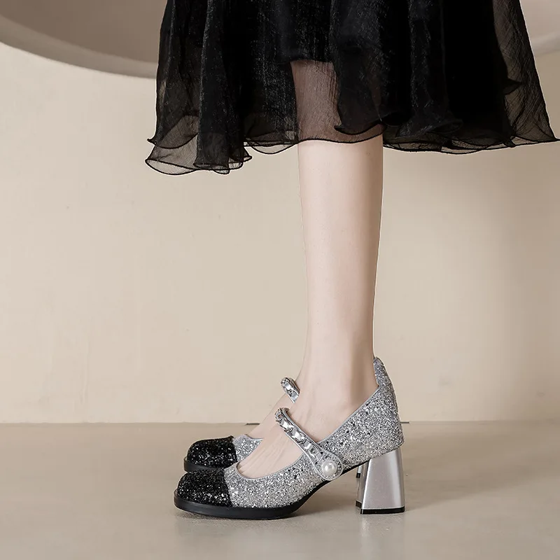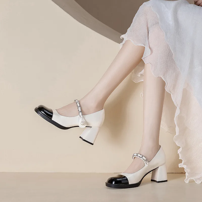 Retro Chunky Heel Mary Jane Shoes Color Matching Pearl Chunky Heel Pumps High Heels for Women