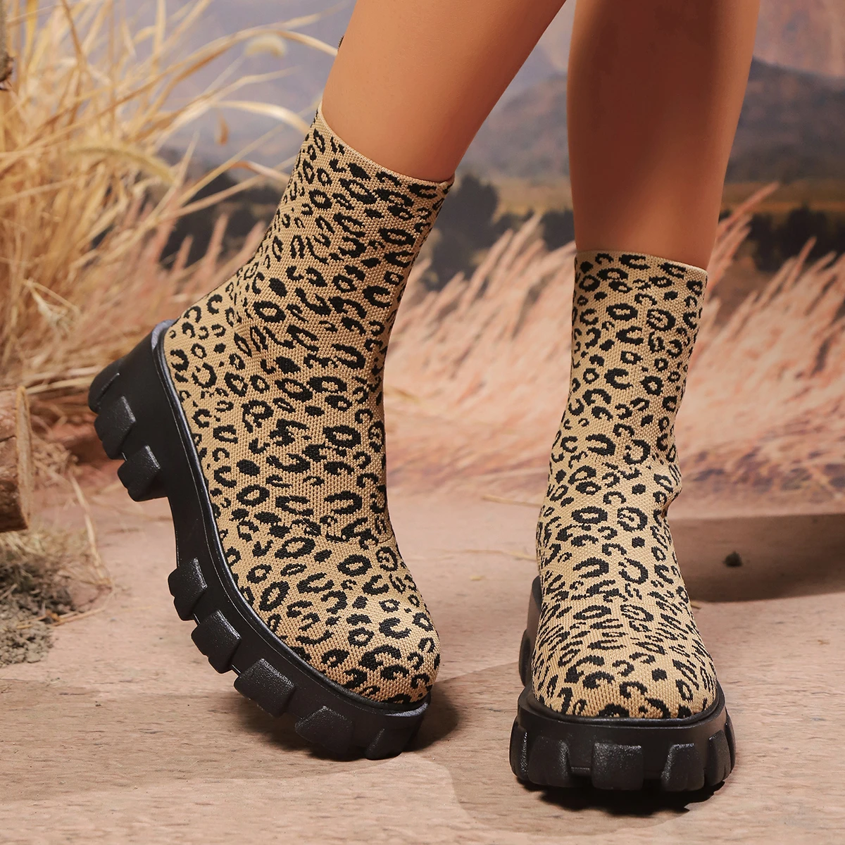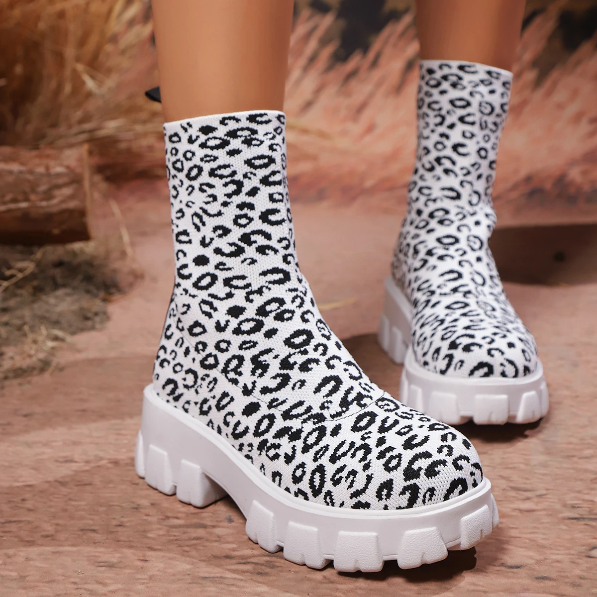 New Leopard Print Elastic Knit Boots for Autumn/Winter 2026 Platform Ankle Boots for Women