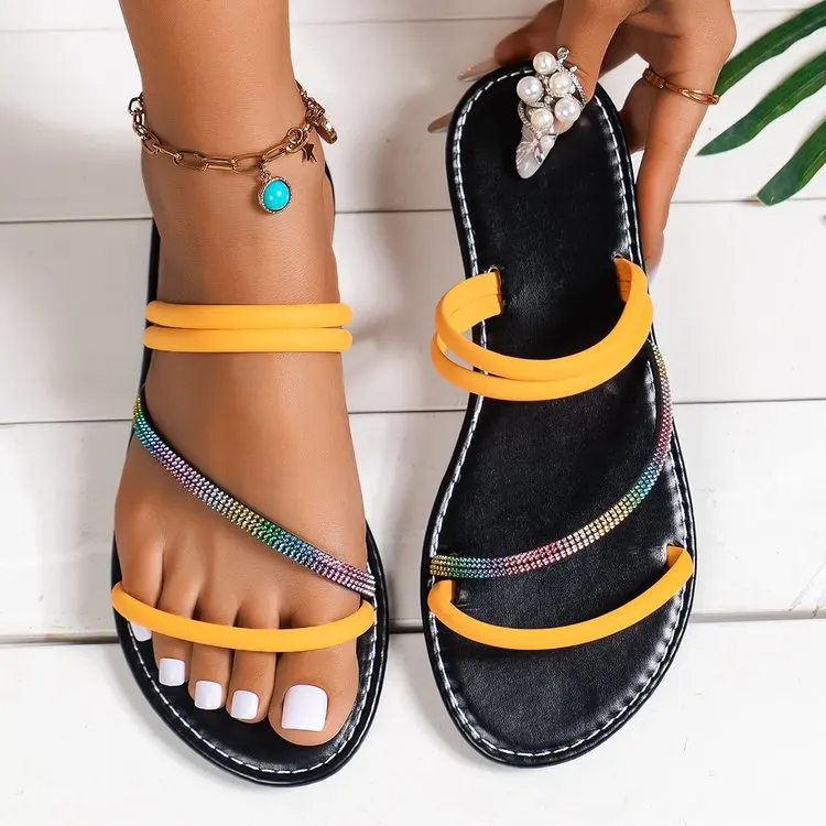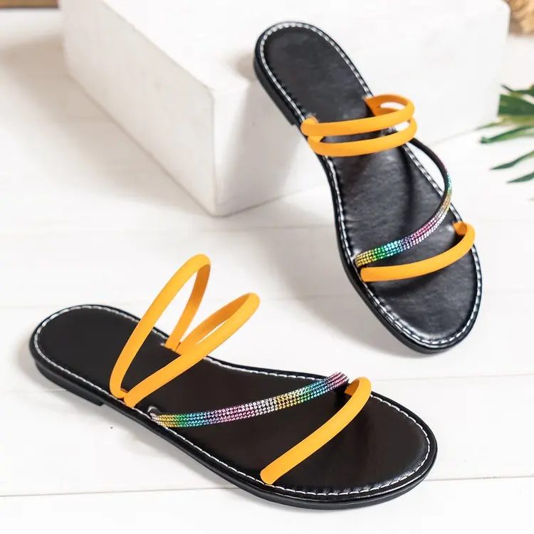 China Factory Wholesale New Summer Flat Sandals Women's Shoes Slippers for Women Rhinestone Decorate Strap Slipper Sandals