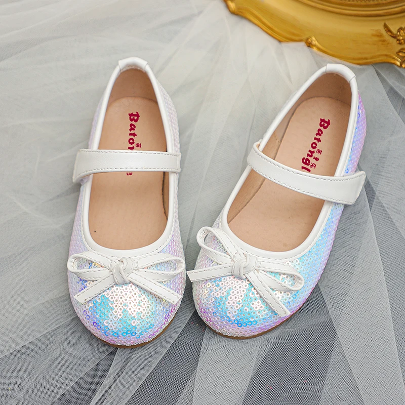 2026 Hot Selling Baby Girls Floral Princess Flat Blue White Genuine Leather Shoes Autumn Spring Summer Soft TPR Sole Lightweight