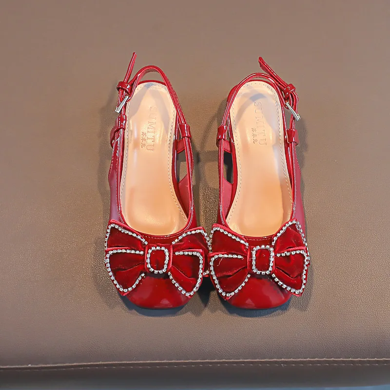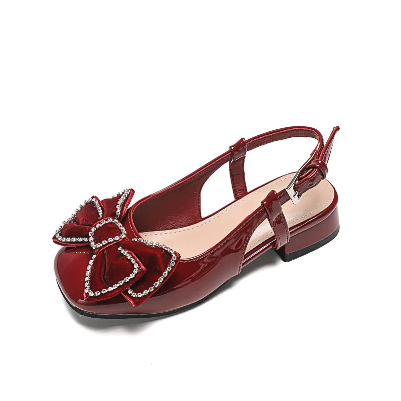 Velvet Burgundy Bow Princess Sandals Toddler Crystal Low Heel Dress Shoes Bow Girl Sandals Wedding Party Princess Shoes for Kid