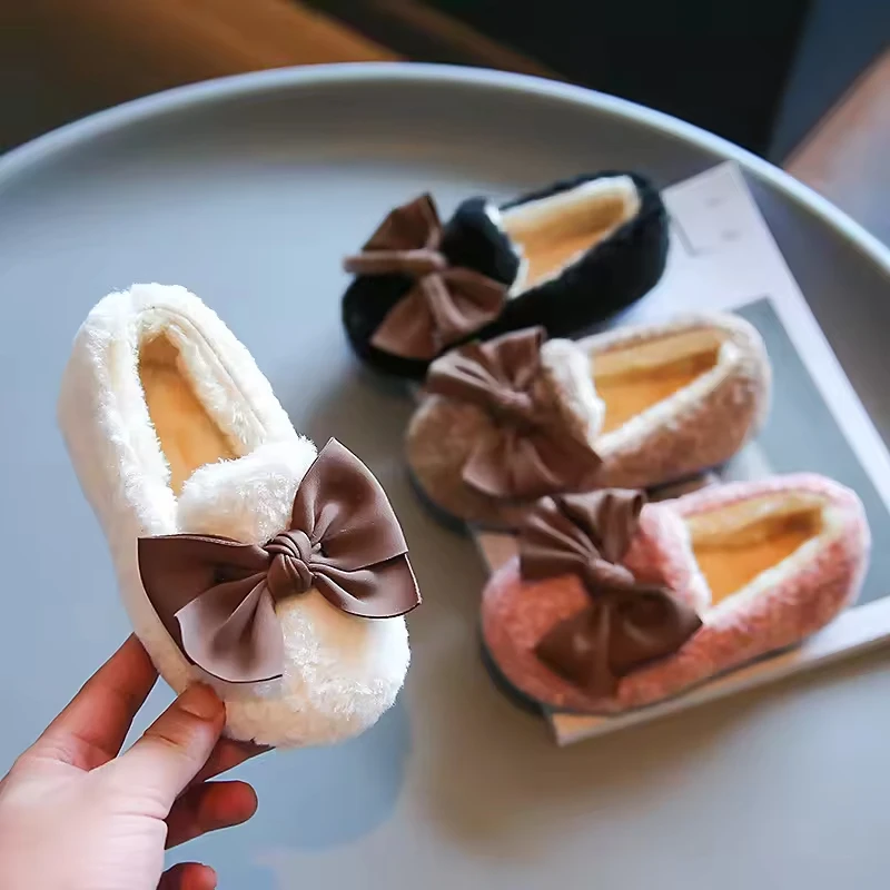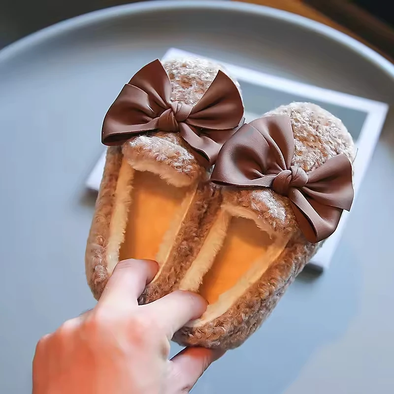 Non-Slip Sole Warm Plush Causal Shoes Indoor Plush Shoes slippers Bow Kid Loafer Shoes for Girls