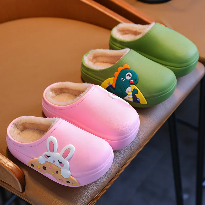 Children's Unisex Plush Slippers Cute Animal Design Dinosaur Soft Warm Non-Slip Winter Slippers PVC Insole Casual Kids Shoes