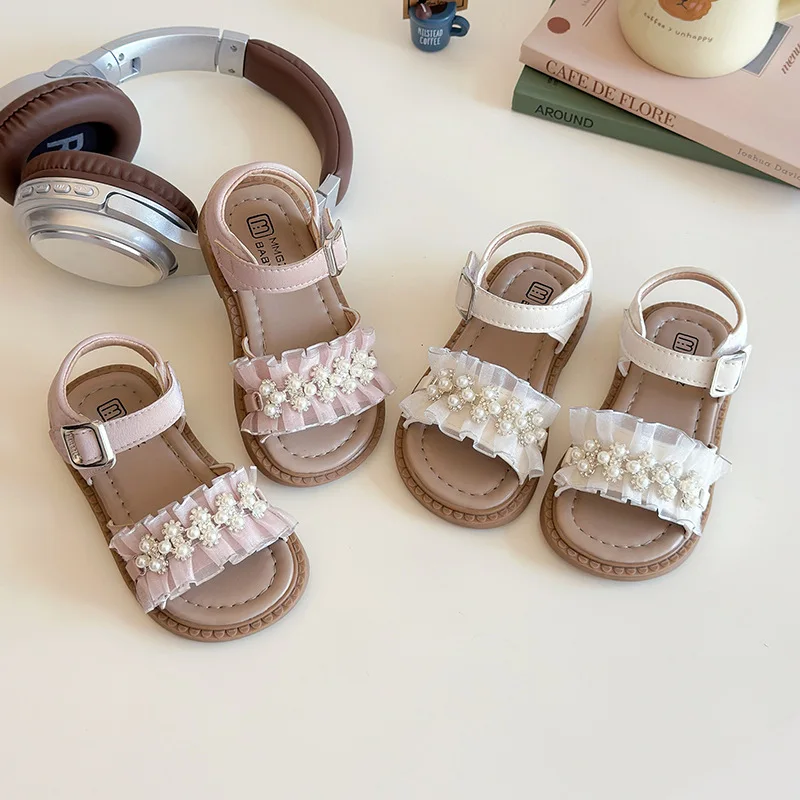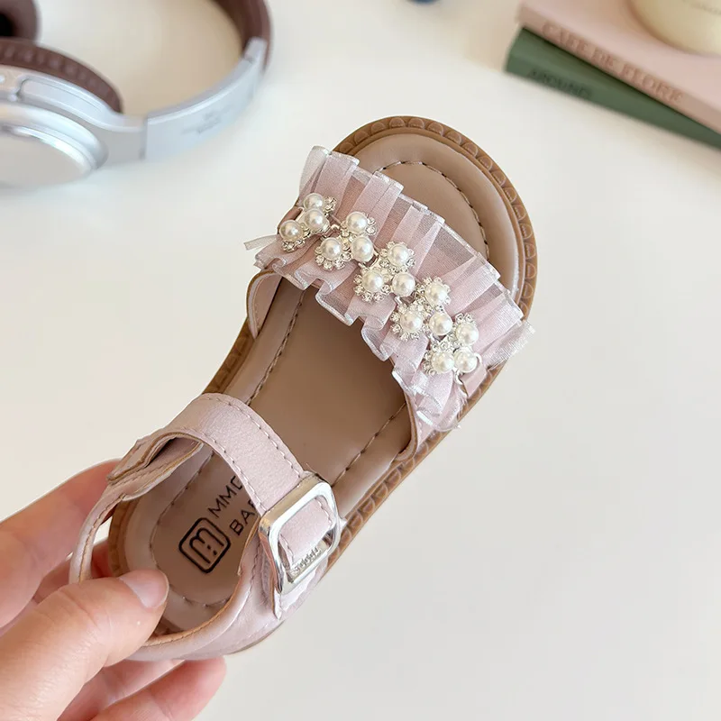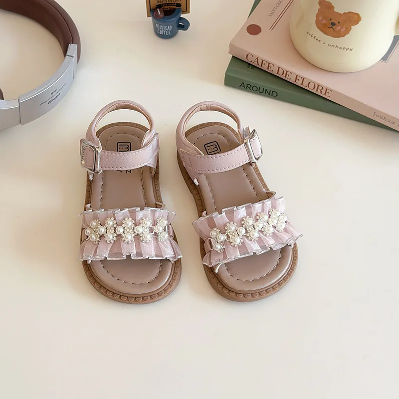 2026 Summer New Girls' High-Appearance Pearl Rhinestone Princess Sandals Cute Soft Sole Beach Shoes for Outdoor Use Slip-On