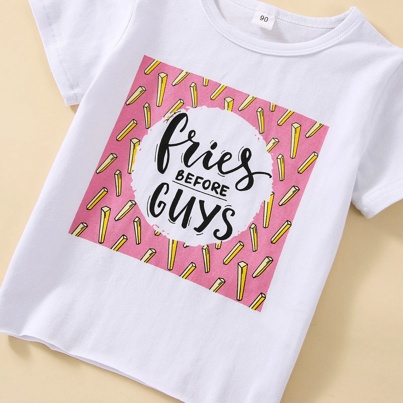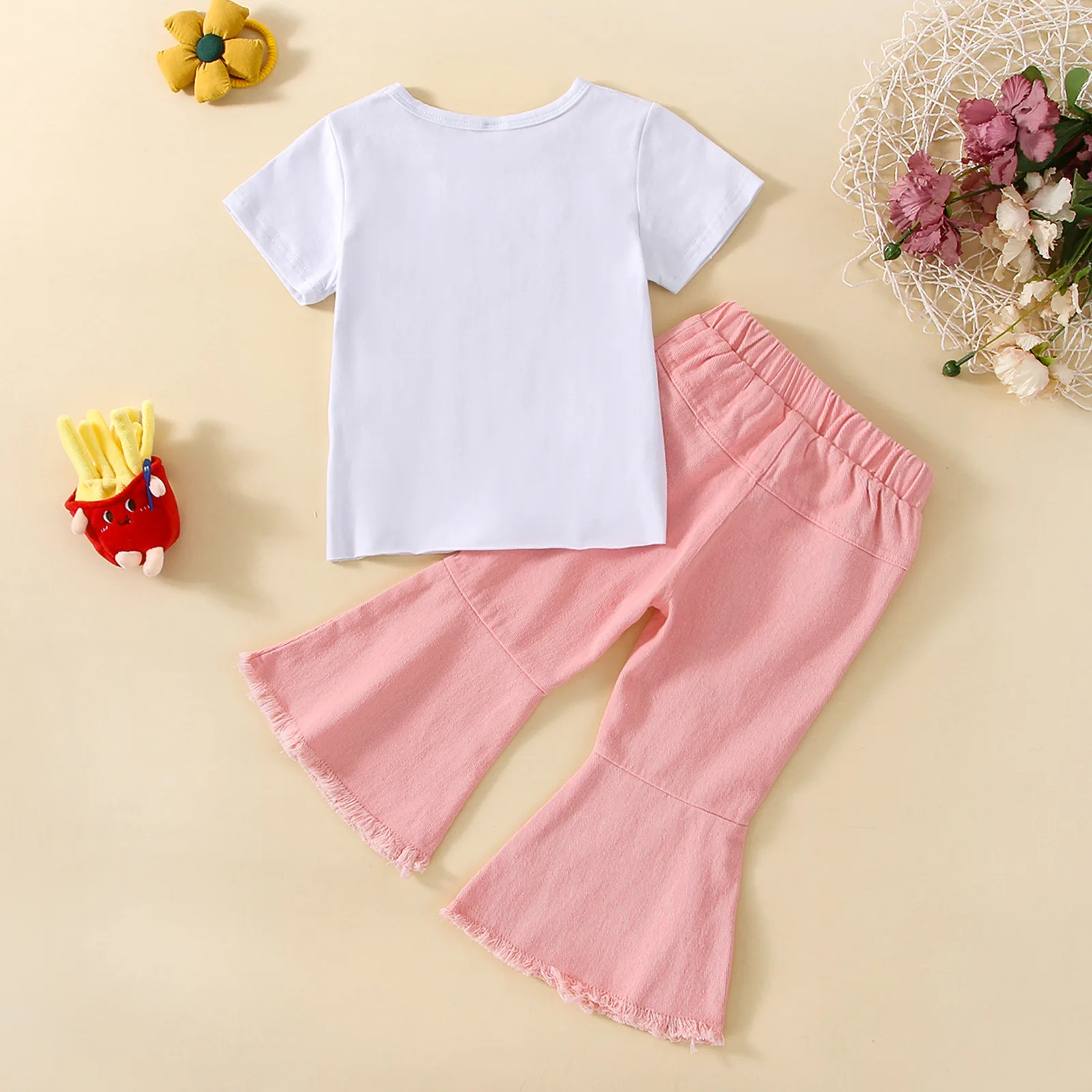 New Girls' Casual Summer Fashion Set Cotton Top & Denim Bell Pants Printed Letters Comfortable Short Sleeves Clothes for Kids
