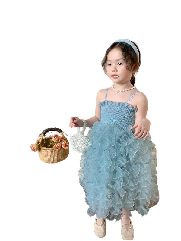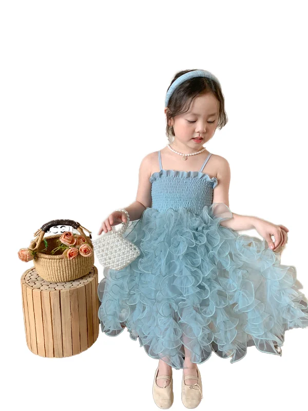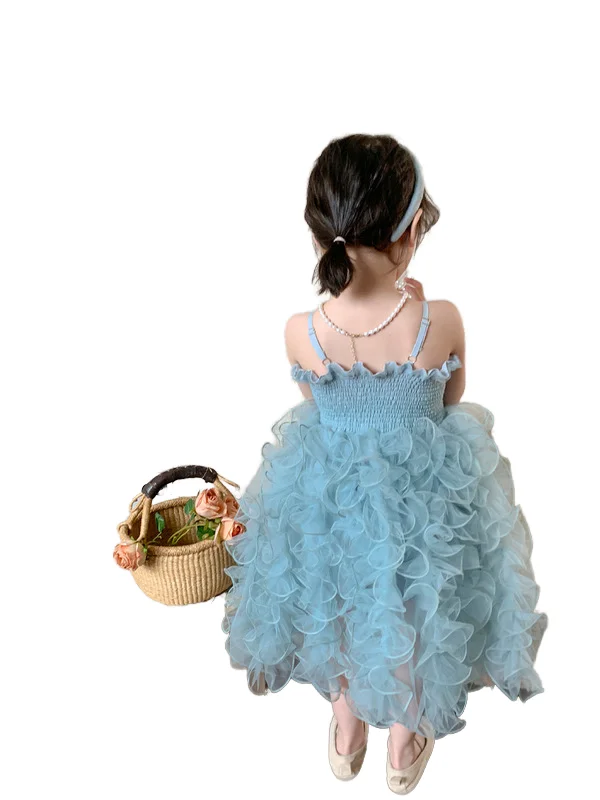 Custom Korean Style Party Dress Long Summer Prom Lace O-Neck Dresses for Girls Gauze Fabric Layered Dress Clothes for Kids