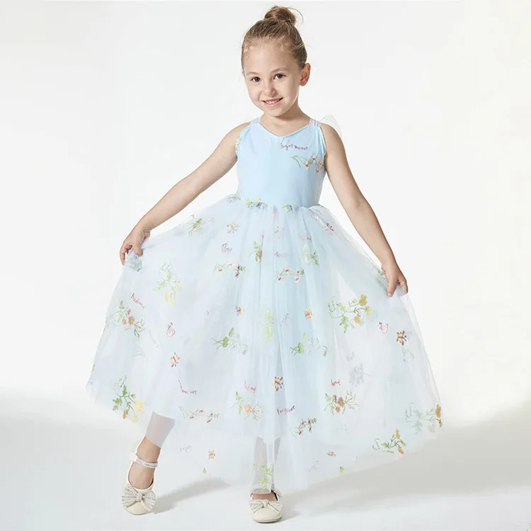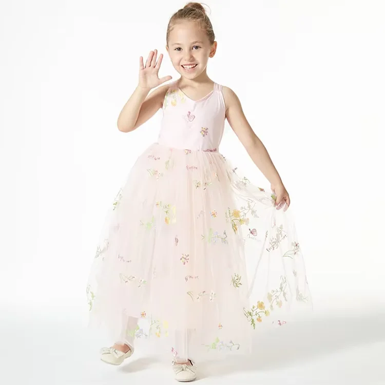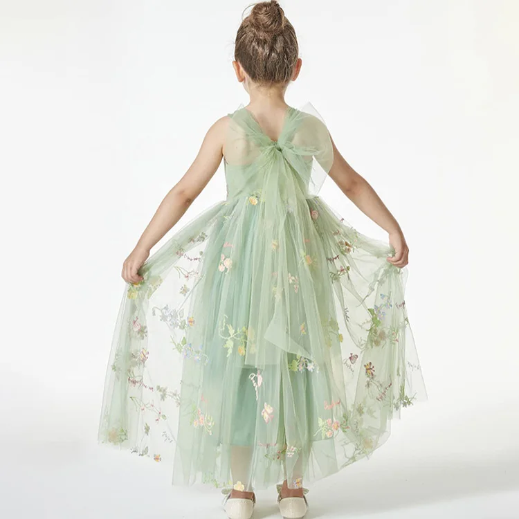 High Quality Beautiful Summer Floral Lace Dress for Girls Exquisite Printed Sleeveless Mash Dress Bow Clothes for Kids