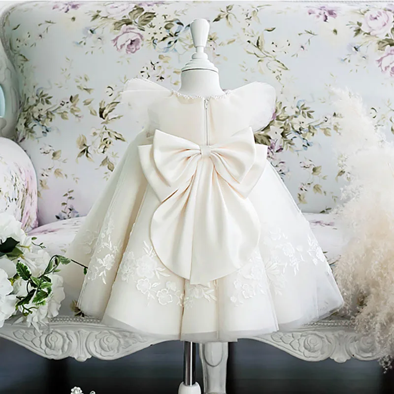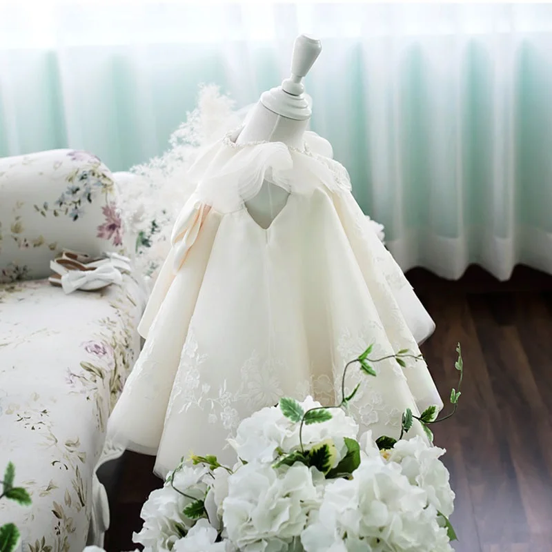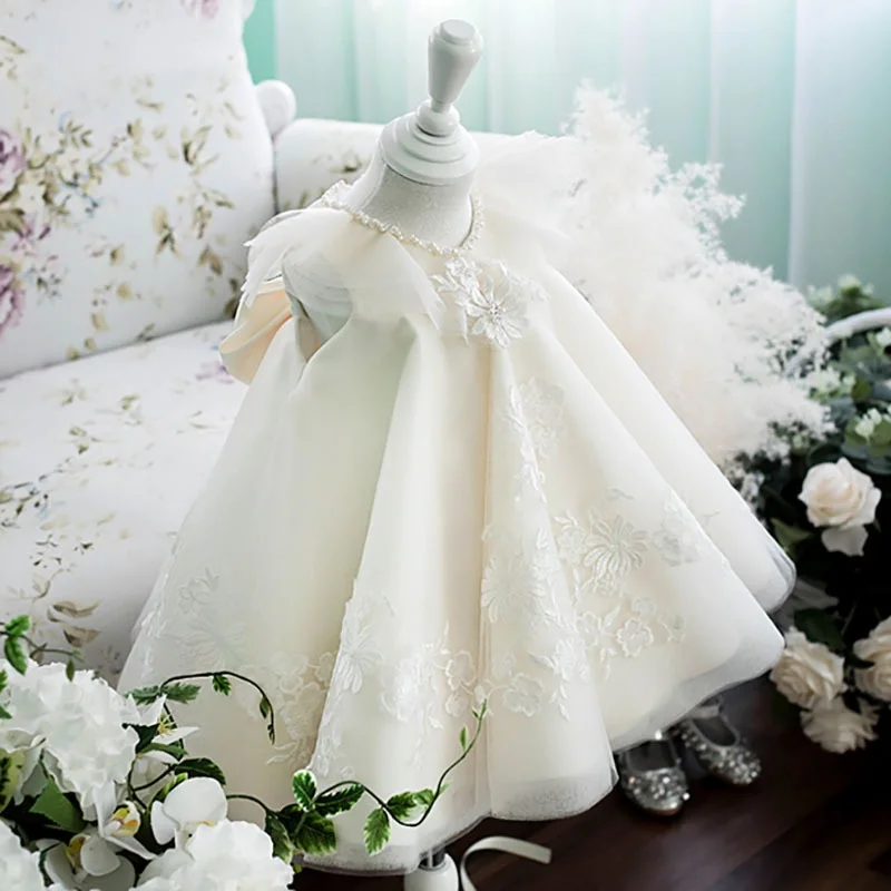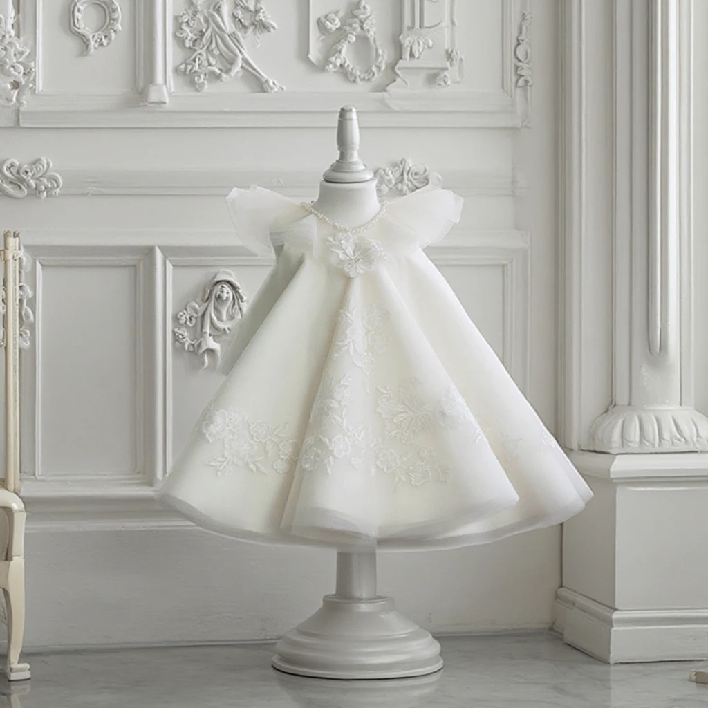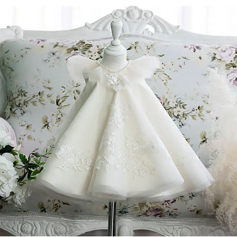 Baby's 1 Year Old Birthday Dress 3D White Princess Gown Kids Wedding Luxury Flower Girl Dress Clothes for Kids