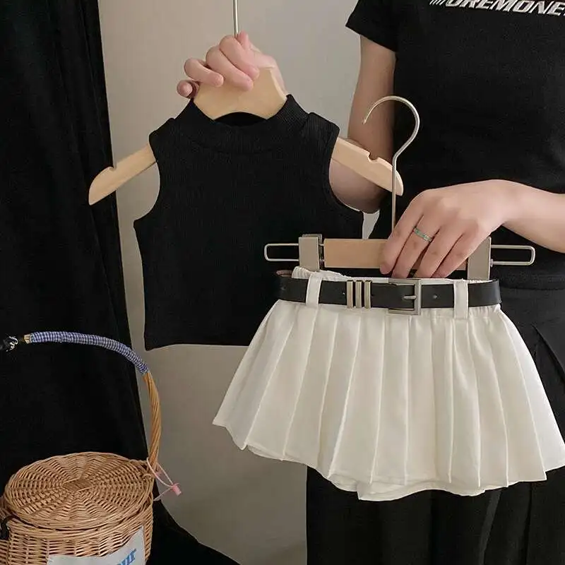 Summer Girls Clothing Sets Korean Style Casual Solid Pattern Sweet Pleated Skirt Pants with Sleeveless Vest Clothes for Kids
