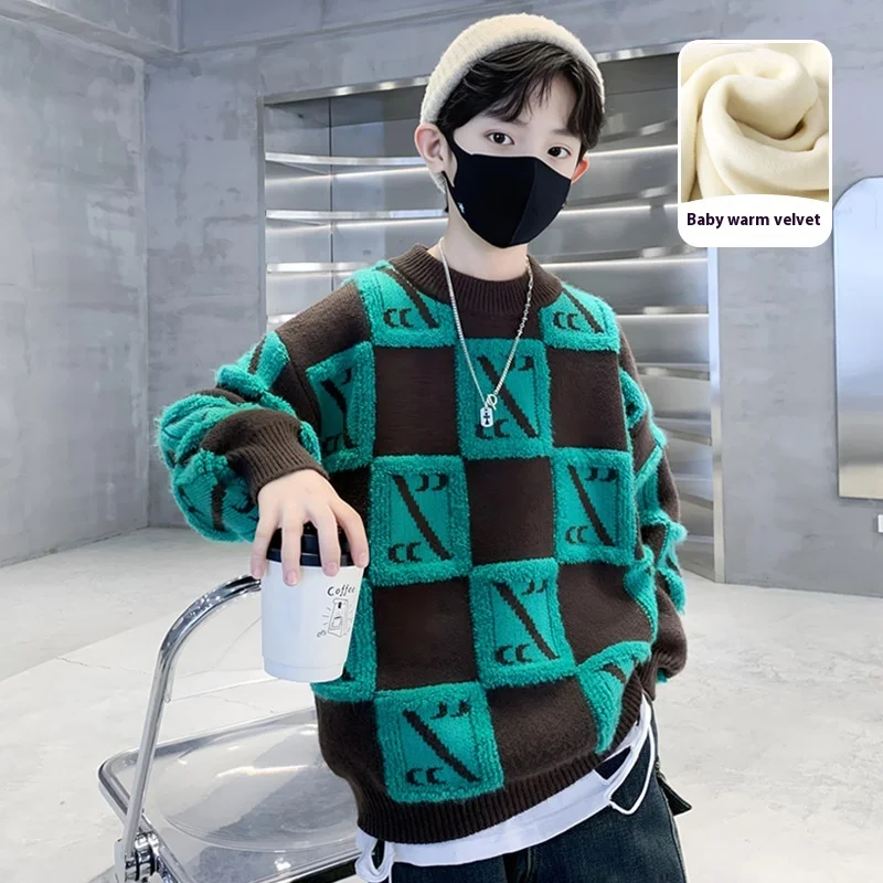 New Boys' O-Neck Cotton Knitted Sweater Winter Thickened Mink Velvet Fleece Lining Autumn Winter Base Shirt Clothes for Kids