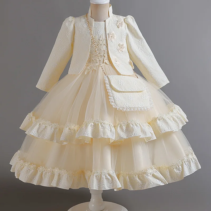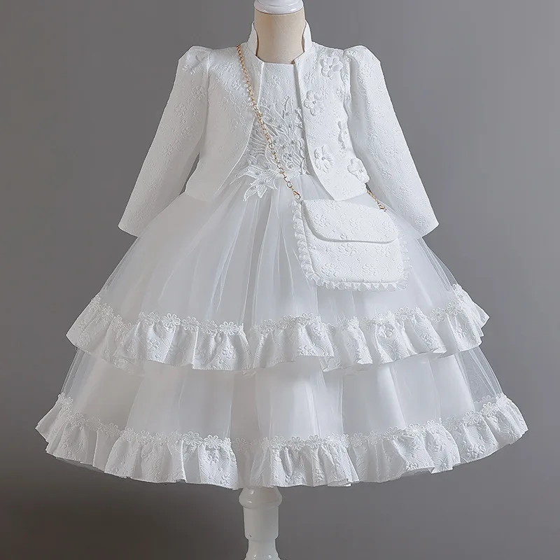 Summer Formal Princess Dress Suit for Girls Pink Chiffon Floral Bow Decoration Maxi Length for Host Performances Clothes for