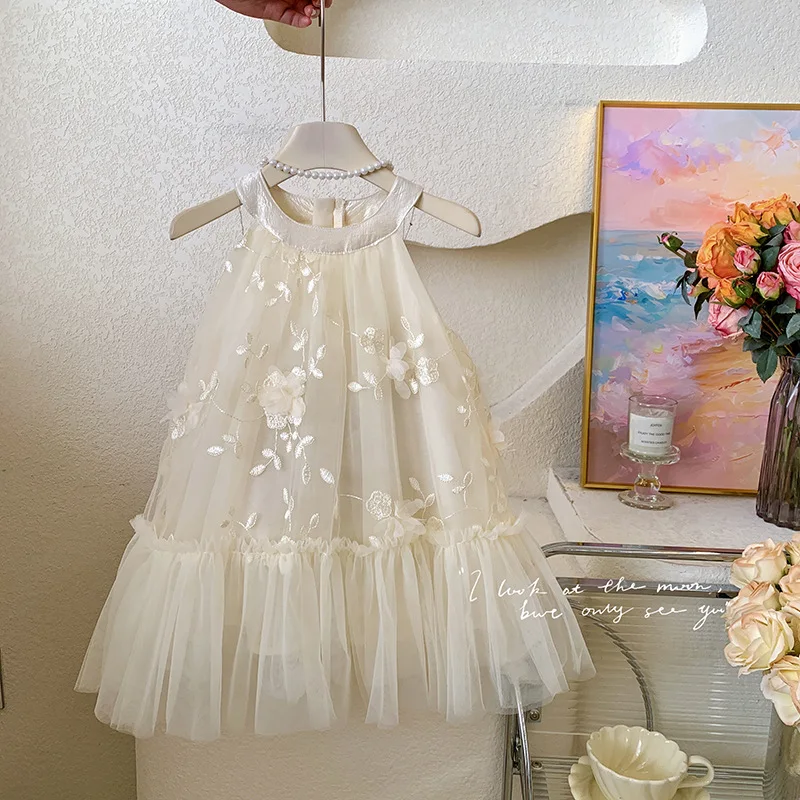 Girls' Summer Floral Formal Dress O-Neck Hanging Neck Fairy Flower Skirt Sweet Style for Children Clothes for Kids