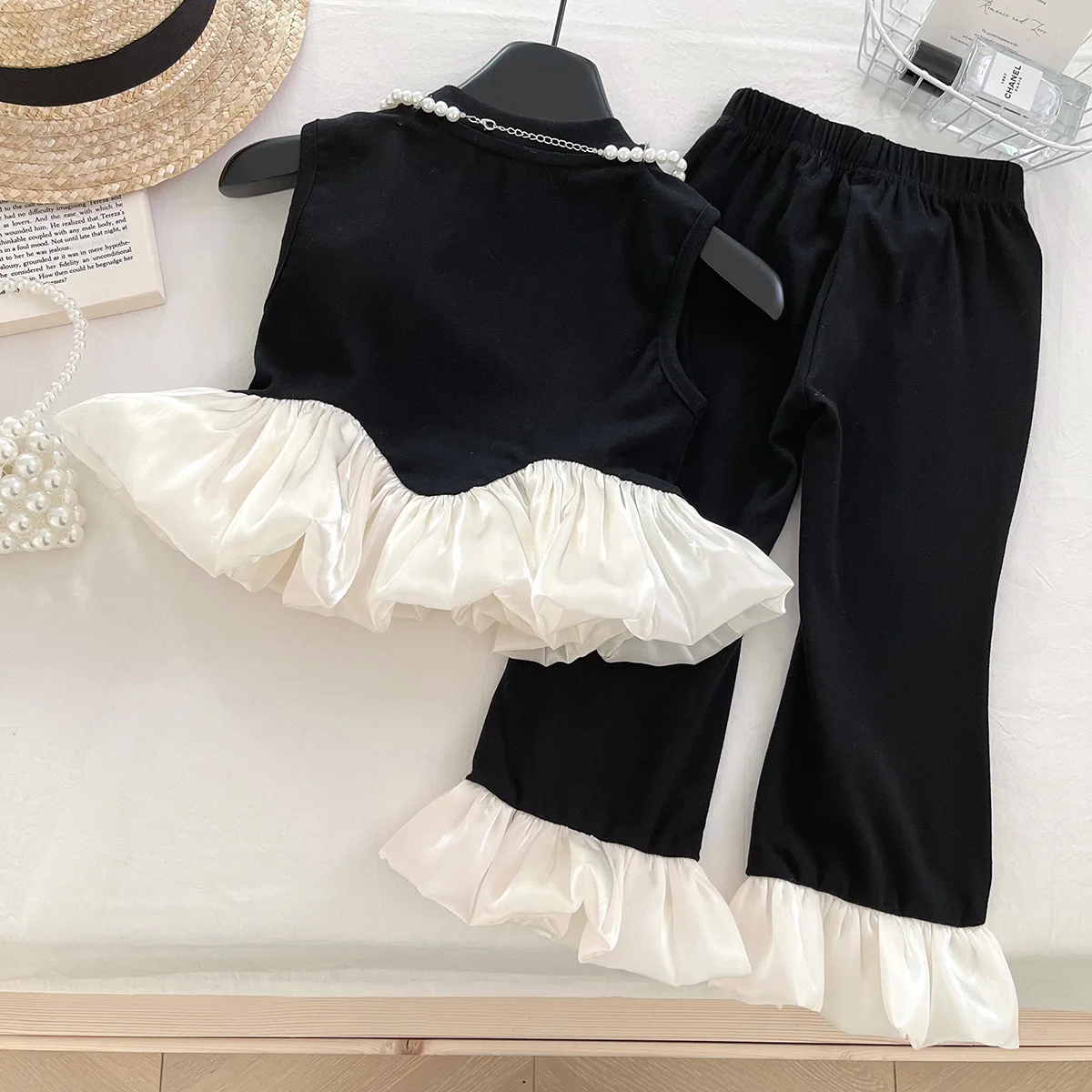 French Style Girls' Summer Outfit - Floral Lace Sleeveless Top + Pants 2-Piece Set Toddler Clothes for Kids