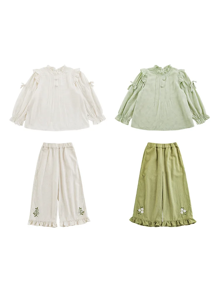Casual Long Sleeve Shirt Pants Ruffles Bows Toddler Baby Girl Two Piece Set Floral Polyester/Cotton Outfit Clothes