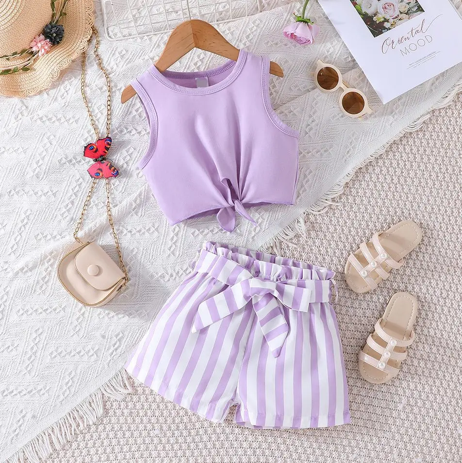2pcs Girls Summer Casual Boutique Style Outfit Solid Color Tie Top and Striped Shorts Polyester/Cotton for Holidays