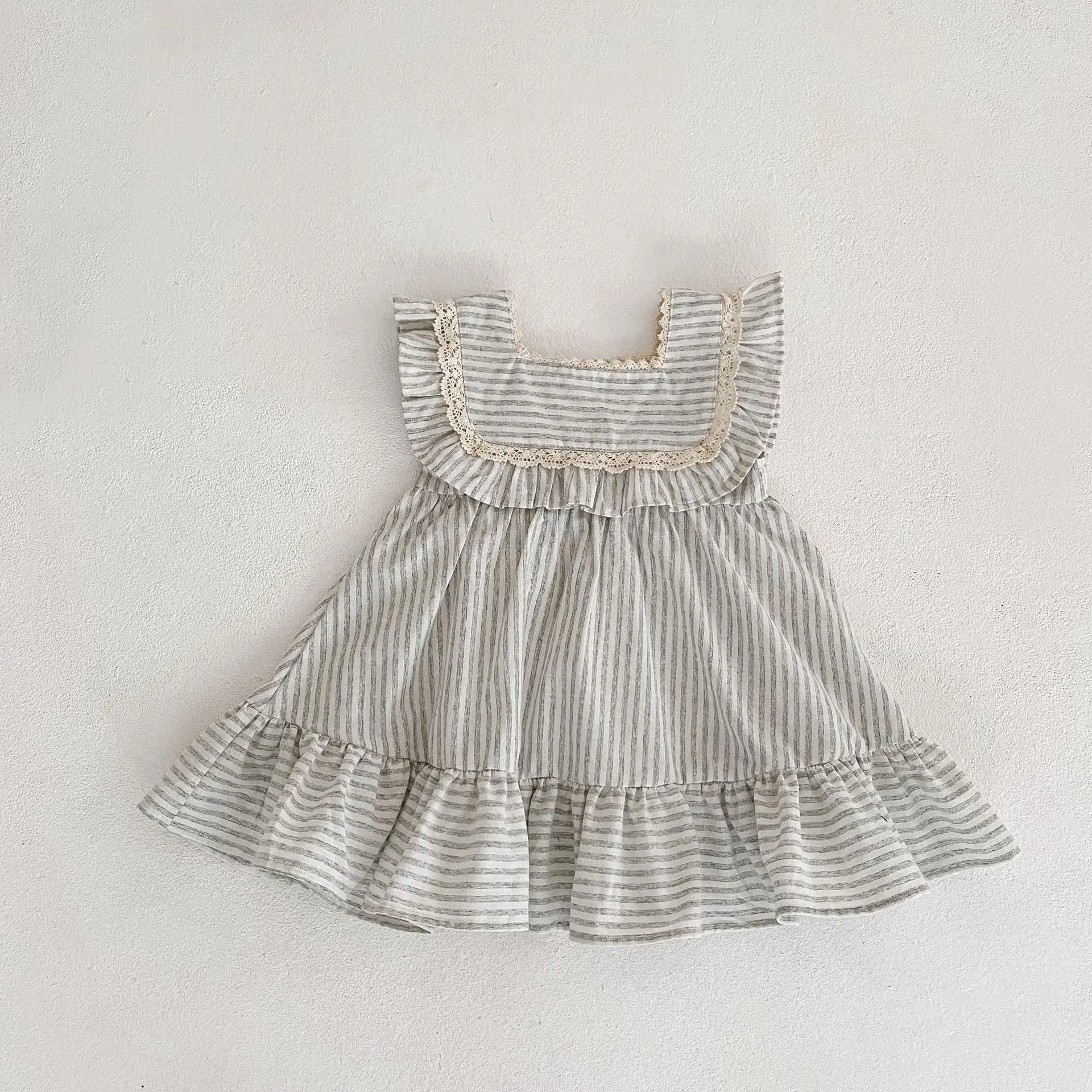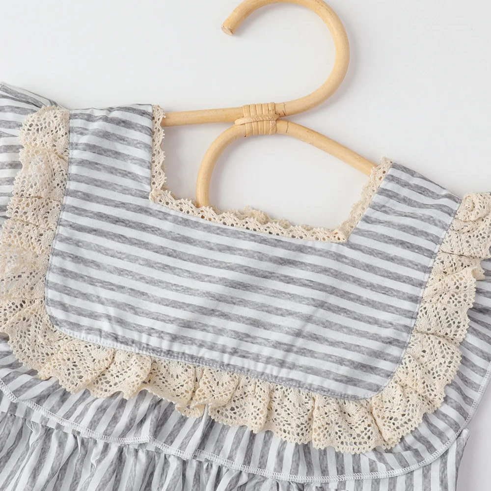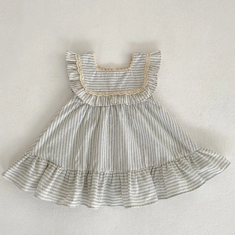 Summer Striped Ruffled Edge Girls' Loose-fitting Elegant Dress Baby Crawling Outfit Sister Clothes for Kids