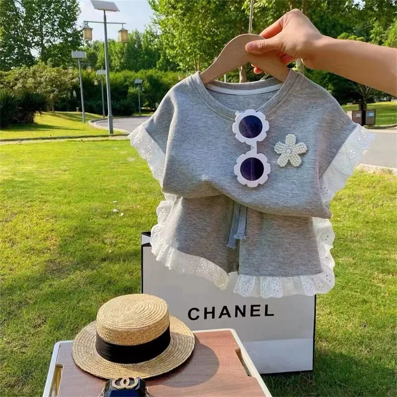 Girls Two Piece Outfit Customizable Cute T Shirt with 3D Bear Embroidery and Lace Trim Skirt Summer Apparel