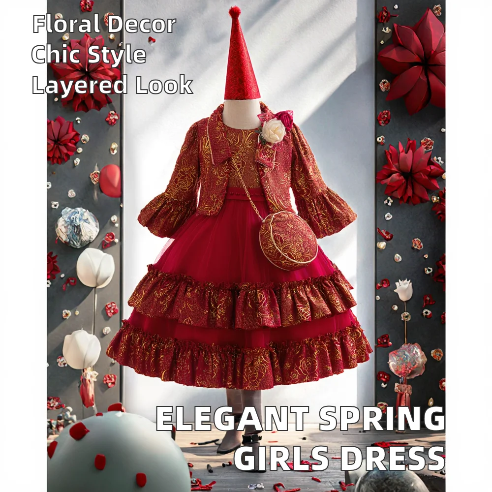Elegant Girls Long Sleeve Layered Dress for Parties New Spring Wine Princess Performance Clothes for Kids Flower Dress Children