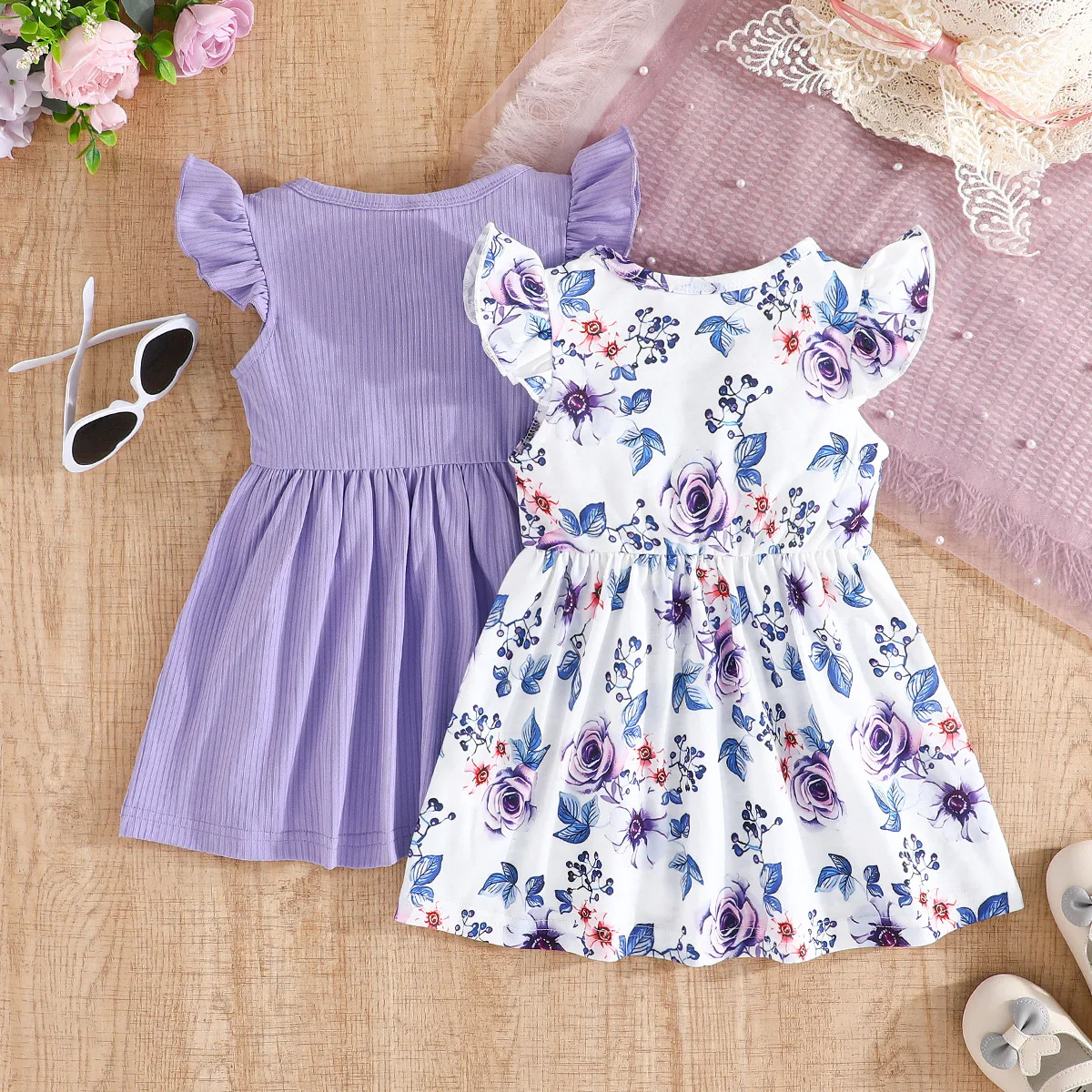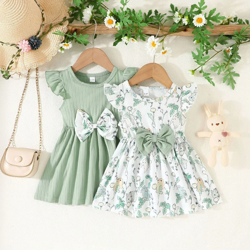New Baby Girls' Solid Pattern O-Neck Casual Dress with Flying Sleeves and Bow Sweet Two-Piece Set for Summer Clothes for Kids