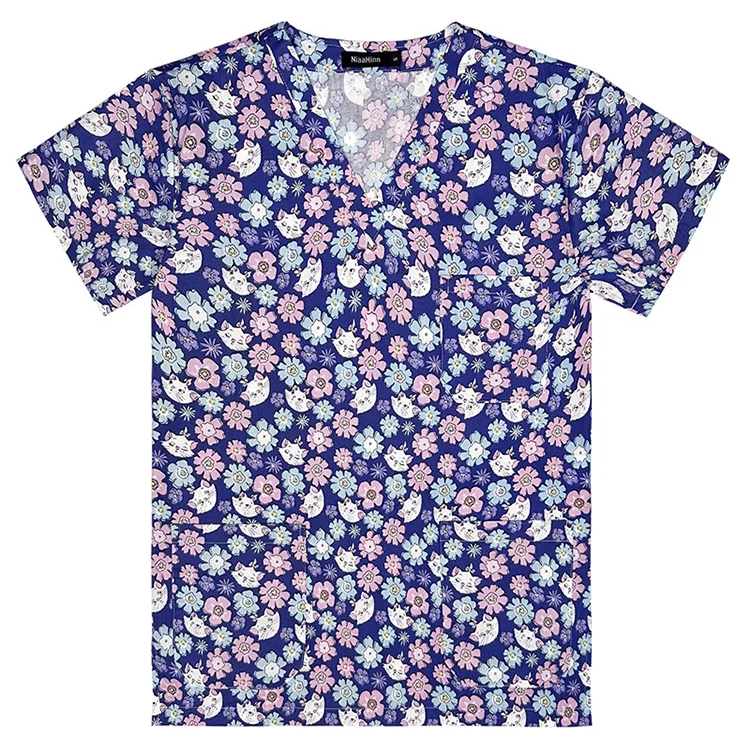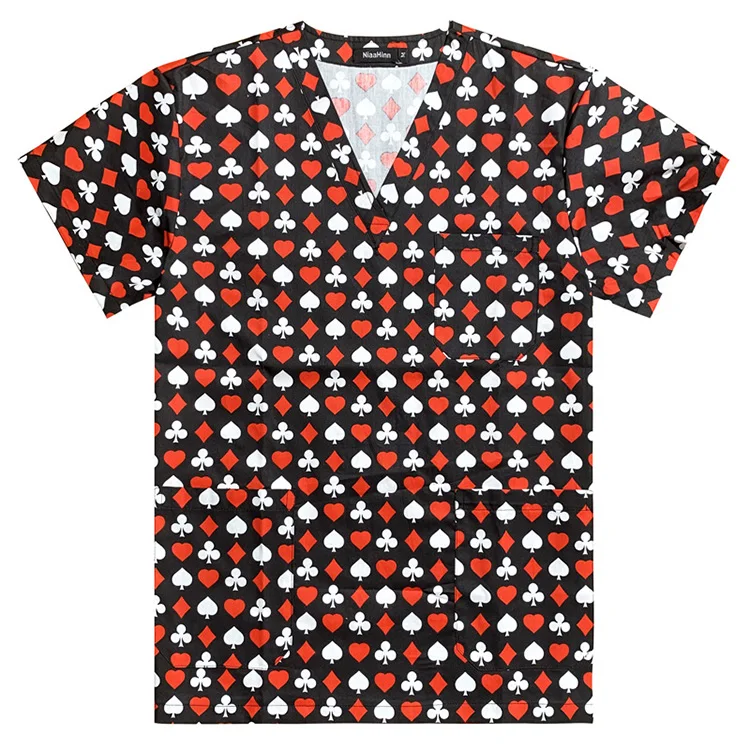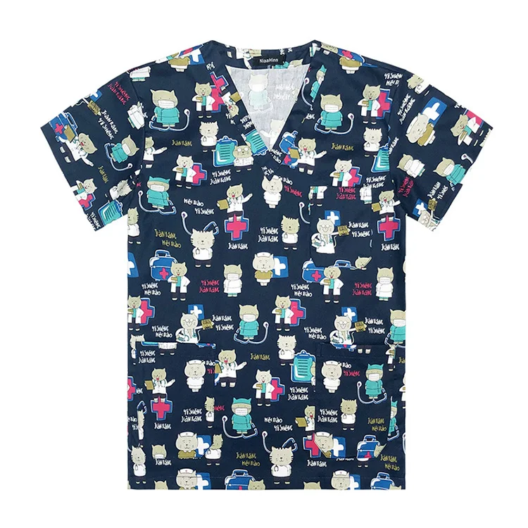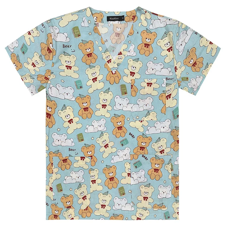 Unisex Woven Cotton Short Sleeve Cartoon Printed Scrubs for Hospital Use Breathable V-neck Design S-2XL Sizes All Season