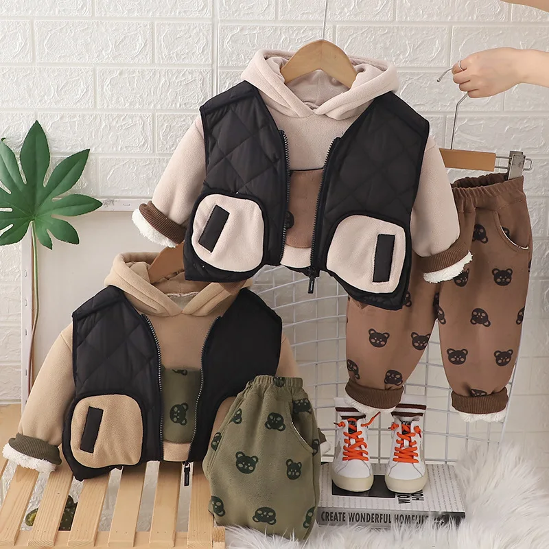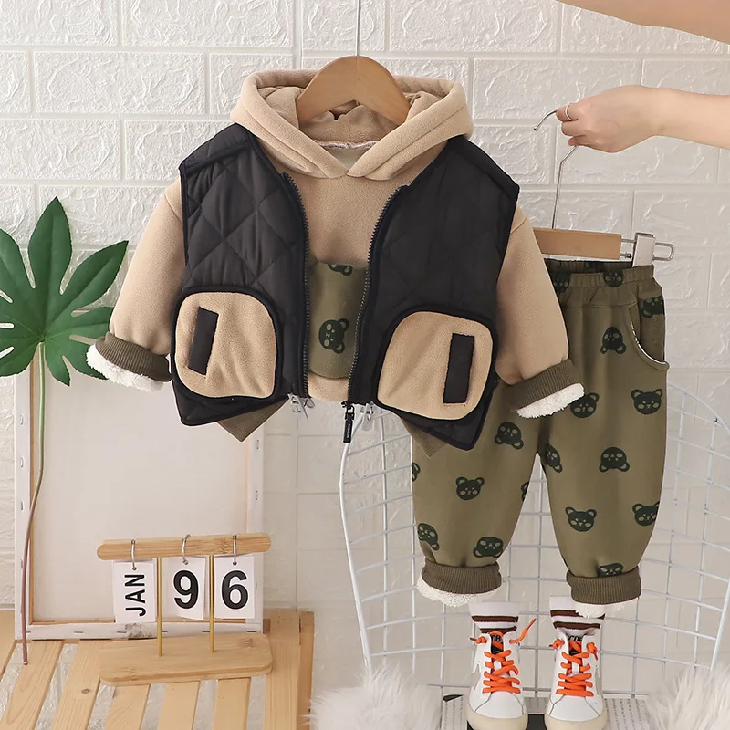 New Children's Casual Winter Clothes for Kids 1-5 Years Baby Boys' Velvet Hoodie Vest Pants 3 Piece Cartoon-Style Set