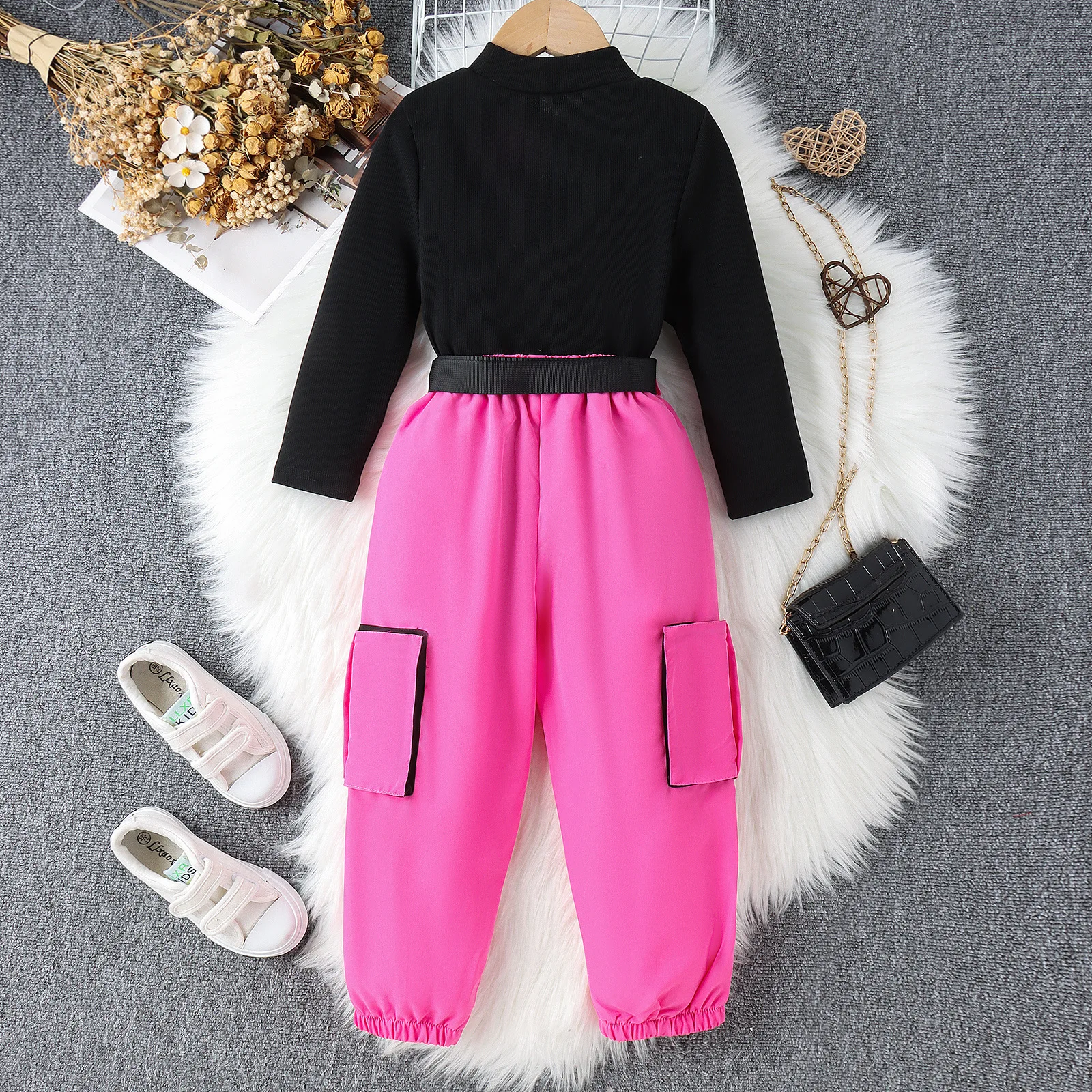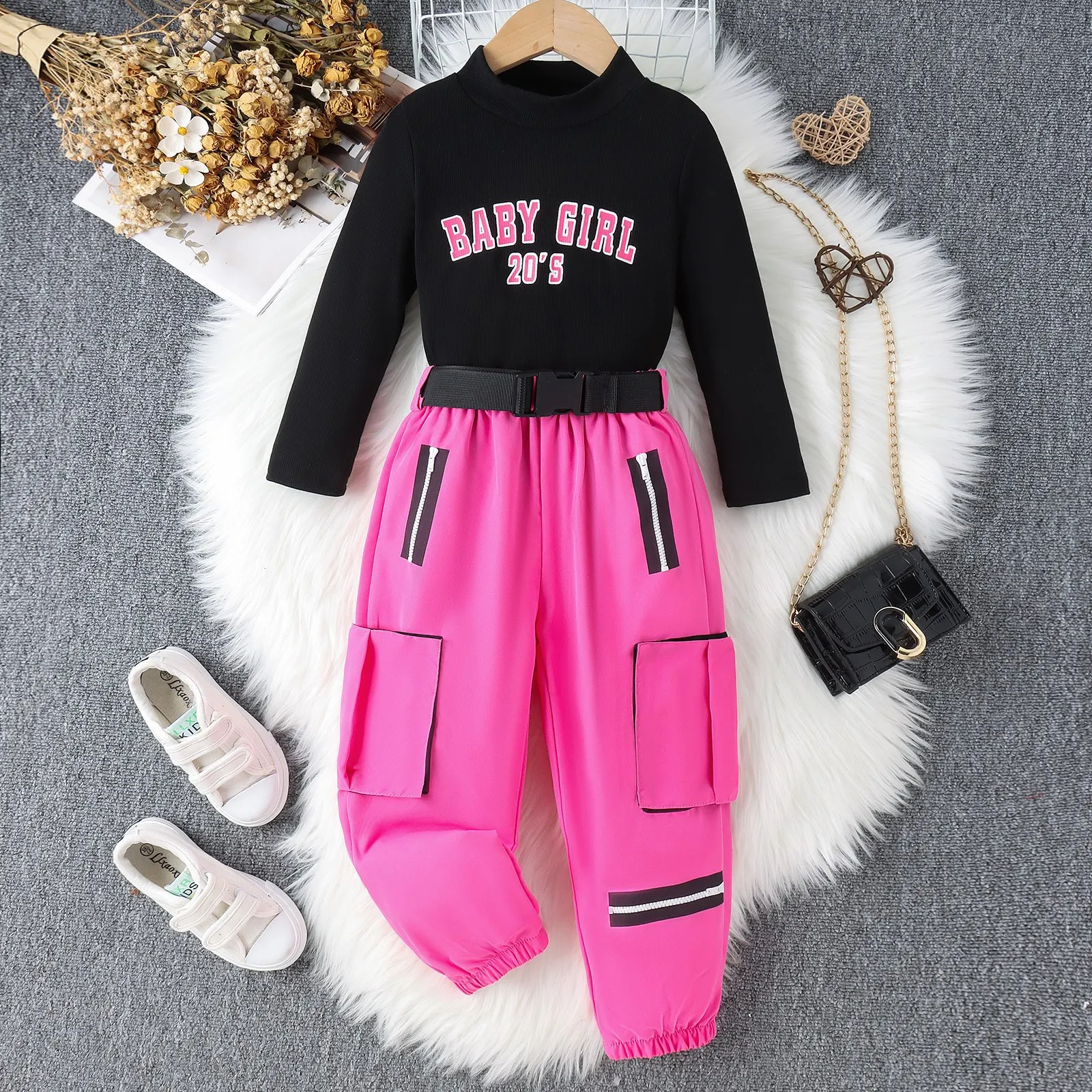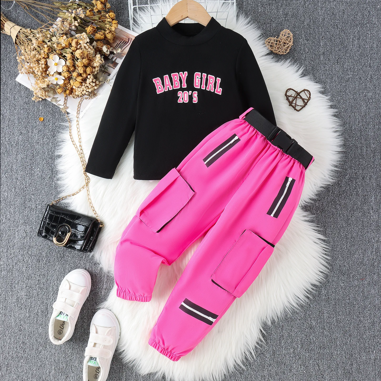 Casual Children's Autumn Winter Clothes for Kids European American High Collar Letter Print Top Cargo Pants Girls 2 Piece Sets