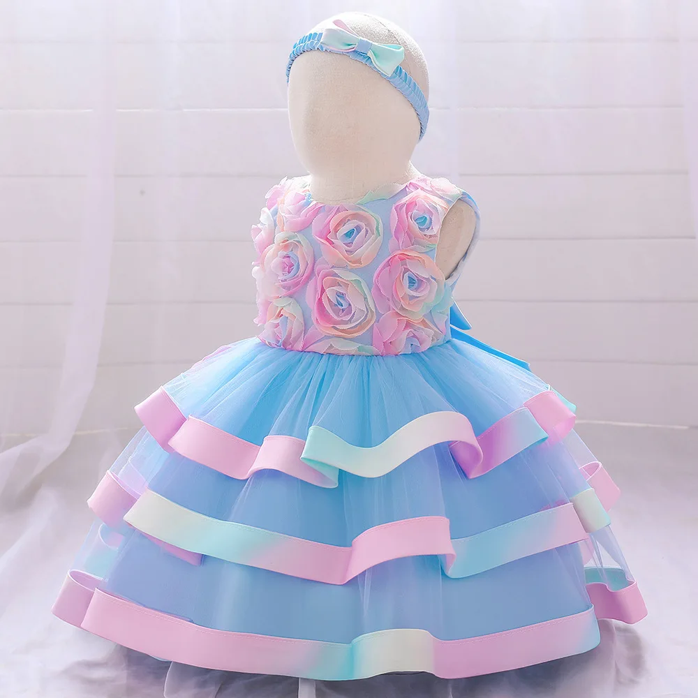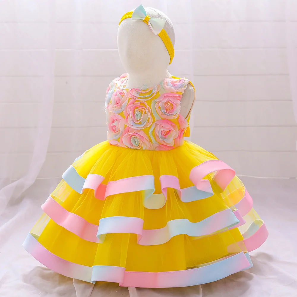 High-end Sleeveless Beaded Summer Dress for Girl Graceful Multi-layer Big Bow 1 Years Old Girls Tulle Dress Clothes for Kids