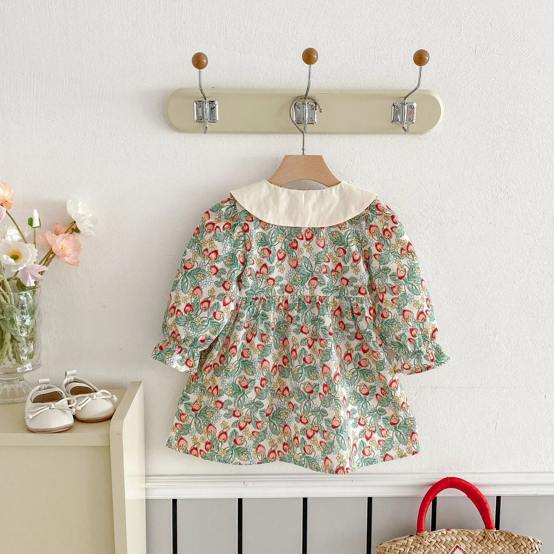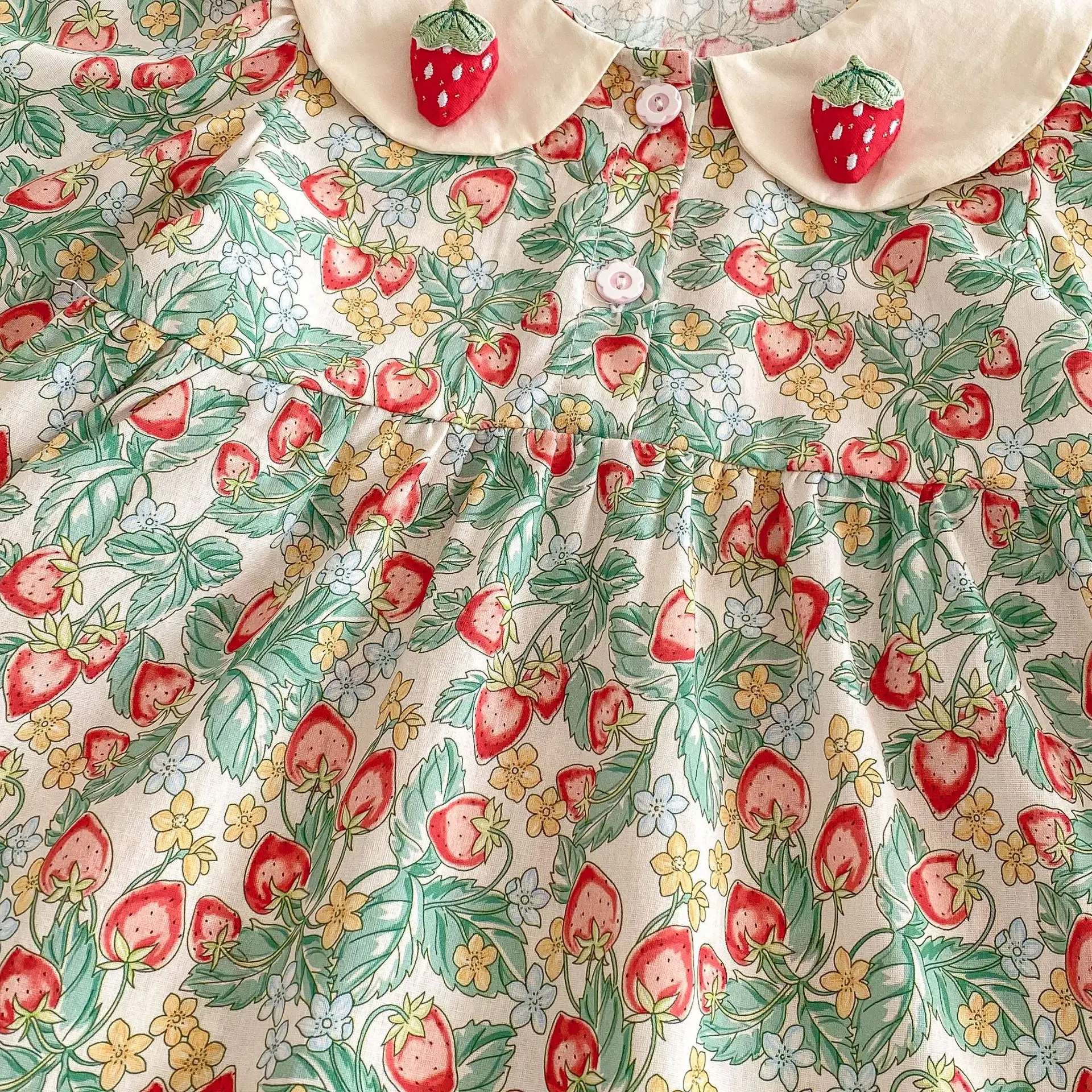 Spring New Korean Style Princess Dress Strawberry Doll Collar Floral Pattern Sweet Style Baby Girls Dress Clothes for Kids