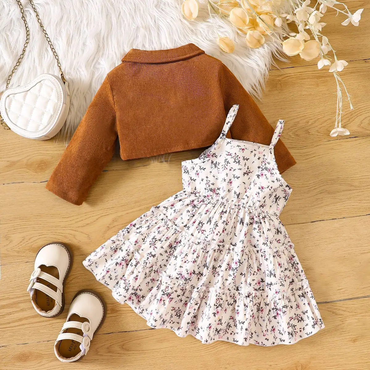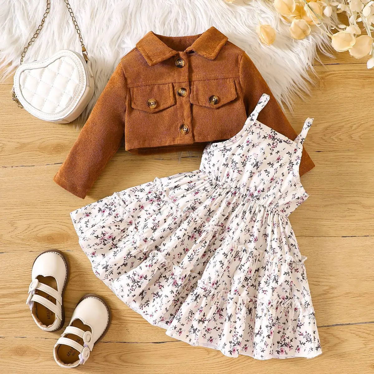 Spring Girls Korean Style 2pcs Set Polyester/Cotton Floral Print Corduroy Short Jacket & Dresses Lower Price Suspender