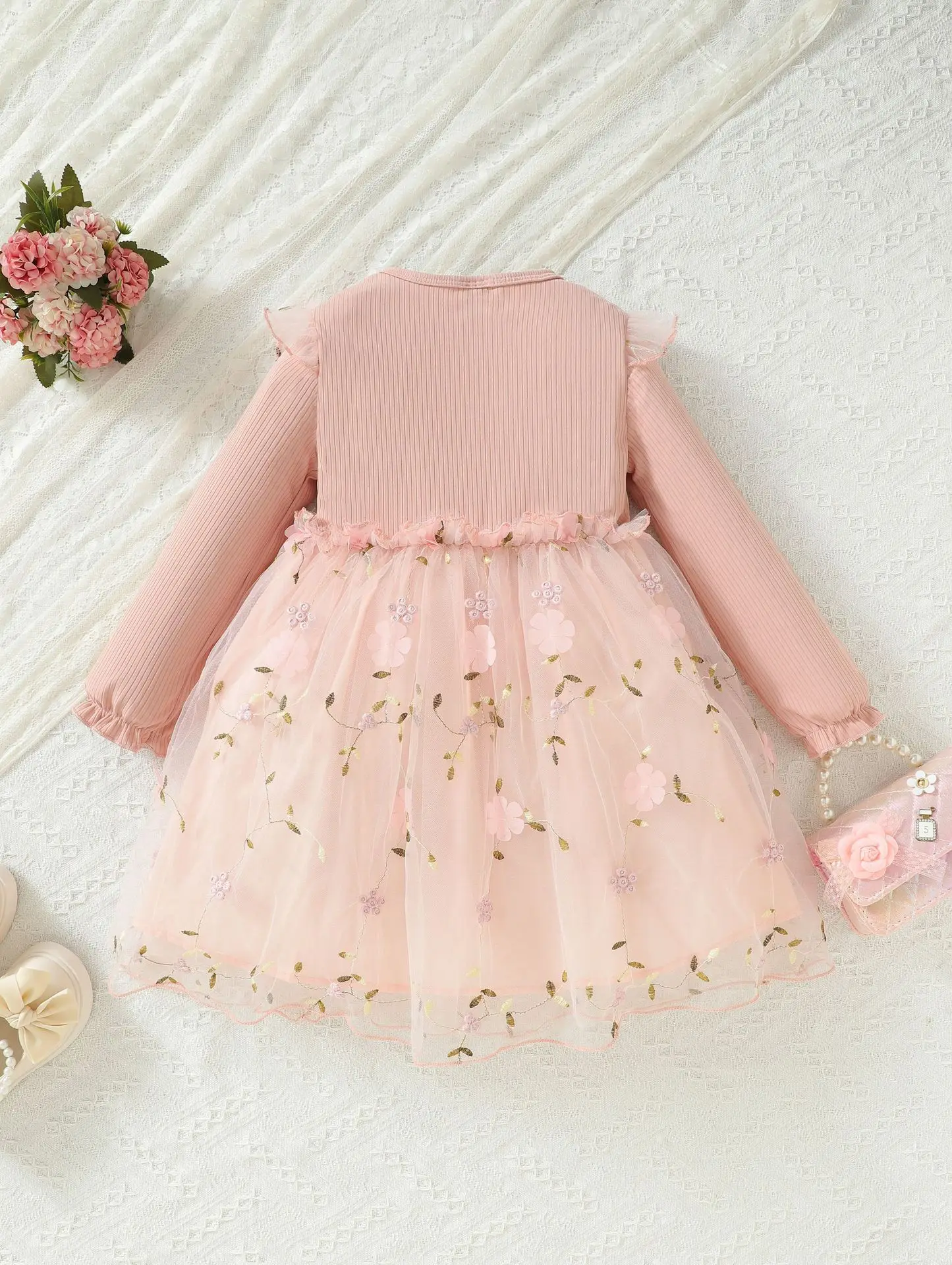 Girls' Sweet Style Floral Princess Dress O-Neck Fly Sleeve Bow Lace and Ruffles Decor Knee-Length Chiffon Clothes for Kids