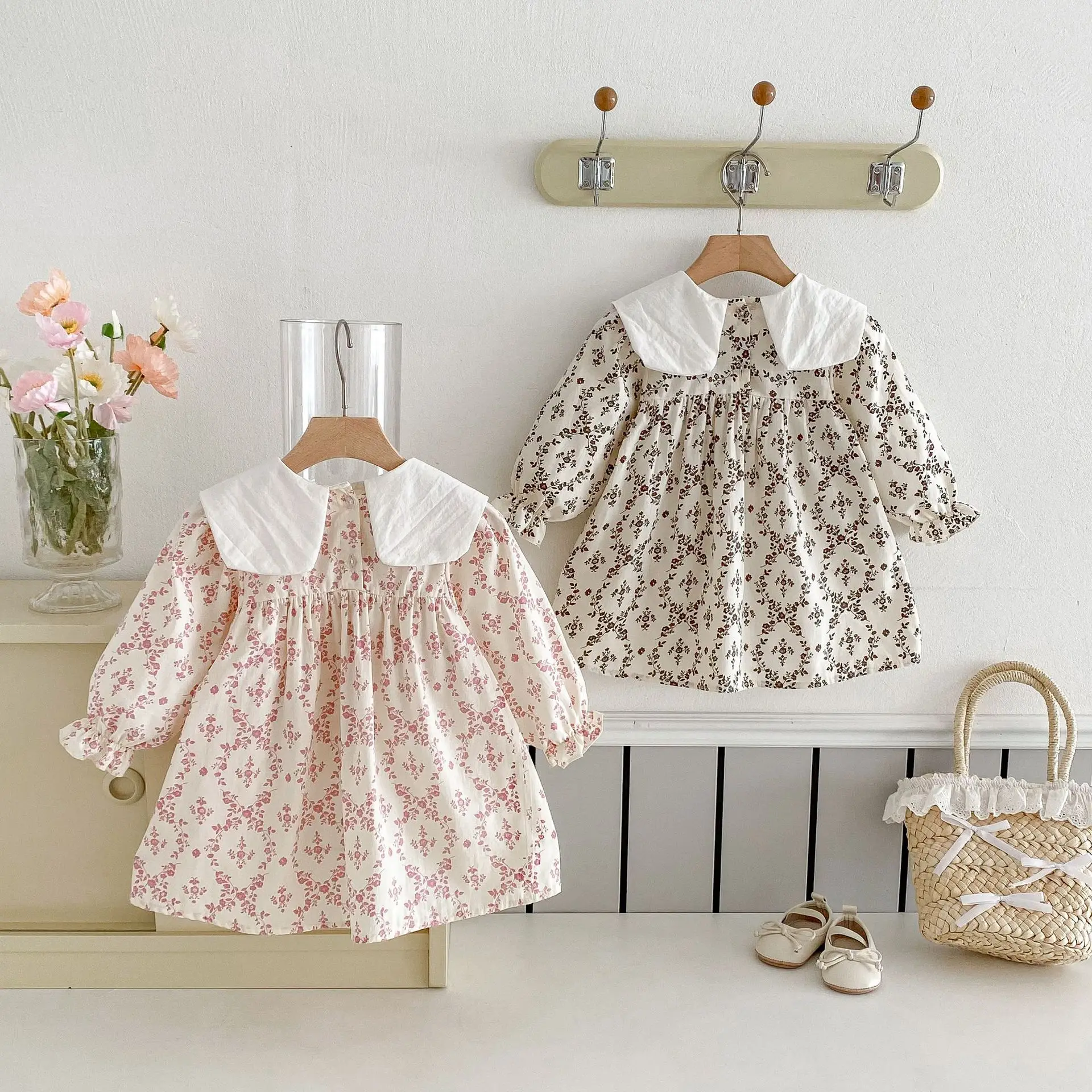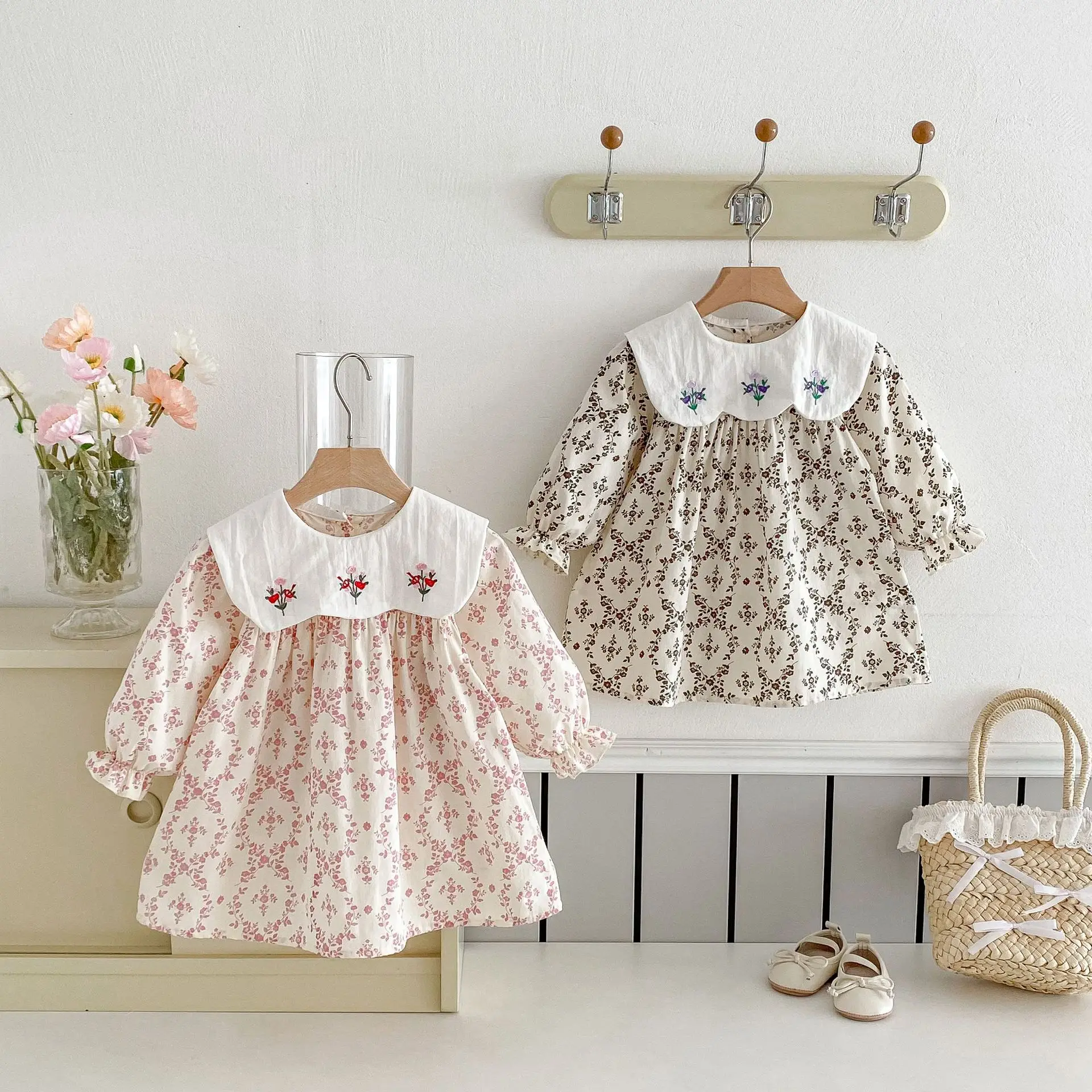 Autumn Korean Style Floral Embroidered Princess Dress for Girls Long-Sleeved O-Neck Casual Collar Sweet Clothes for Kids