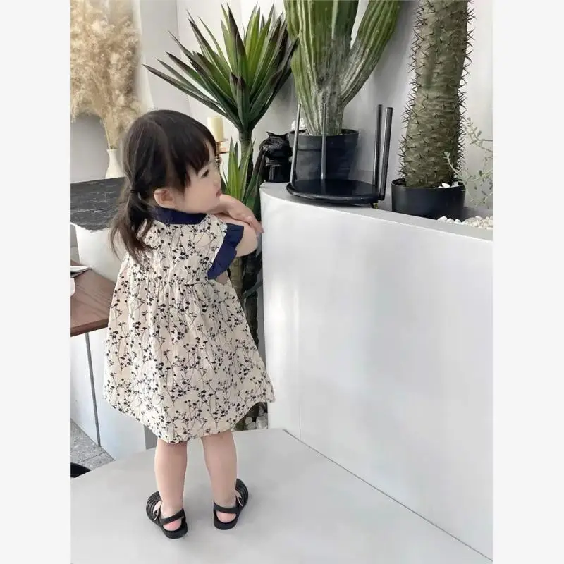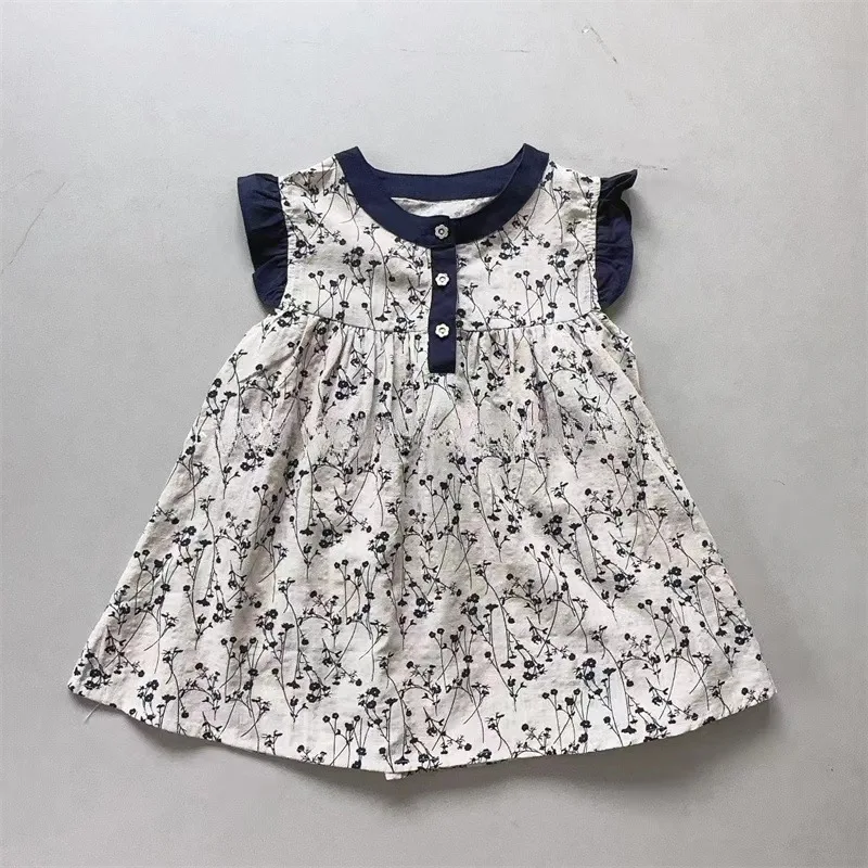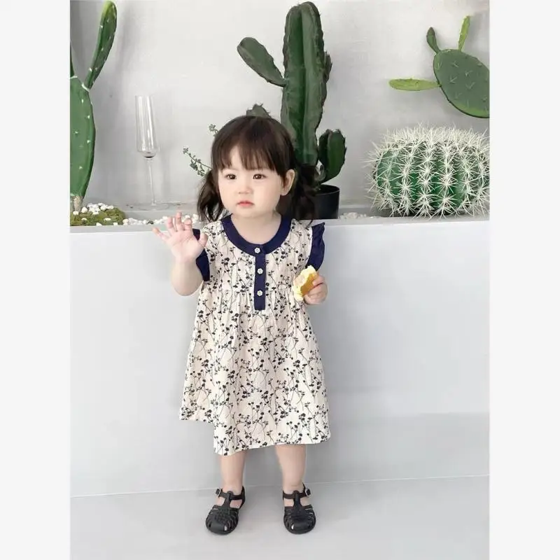 Girls Summer Dress Korean Retro Print Small Flutter Sleeve Princess Dress Solid Pattern Party Knee-Length Skirt Clothes for Kids