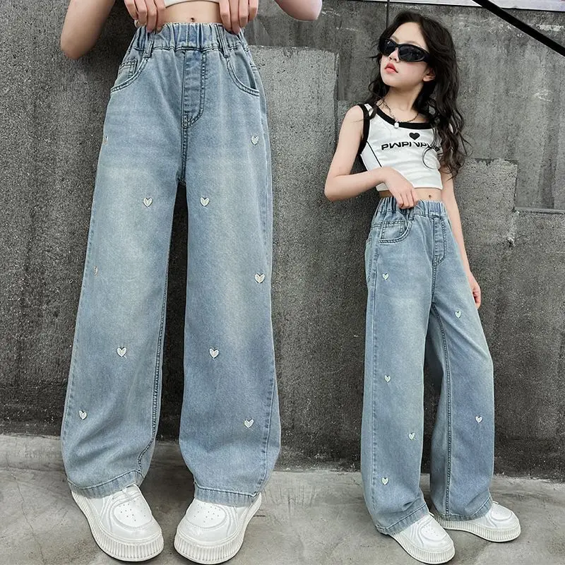 New Summer Casual Breathable Lyocell Denim Baggy Wide Leg Straight Jeans with Heart Pattern for Girls and Kids