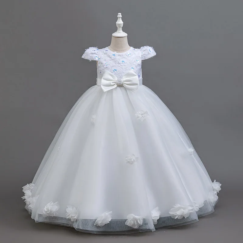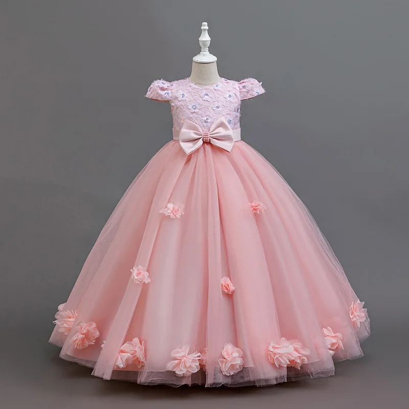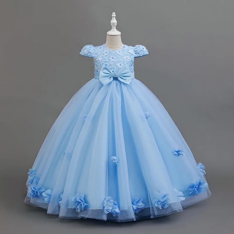 Girls Satin Piano Performance Dress for Children's O-Neck Solid Formal Party Dress Knee Length Mesh Layered Clothes for Kids