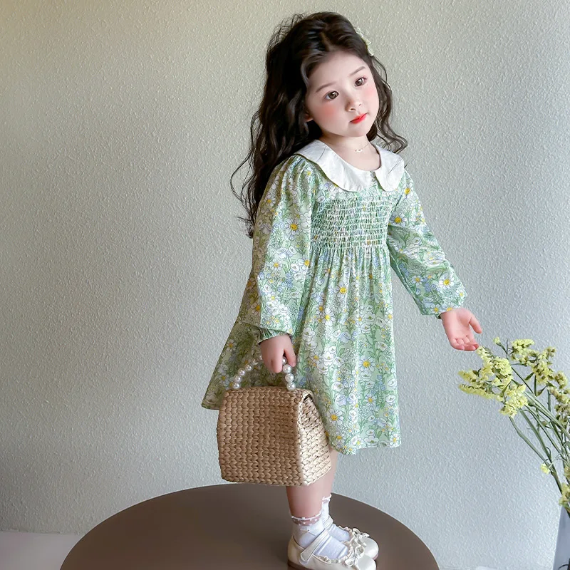 Autumn Children's Girls Dress Charming Peter Pan Collar Smocked Bodice Vibrant Floral Pattern Lace Waist Bow Clothes for Kids