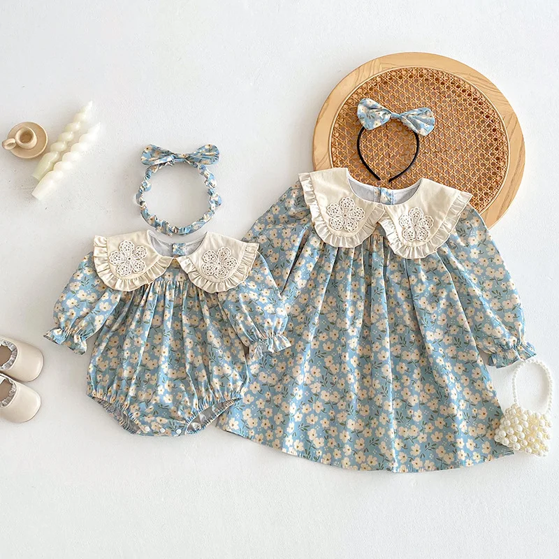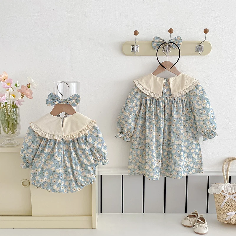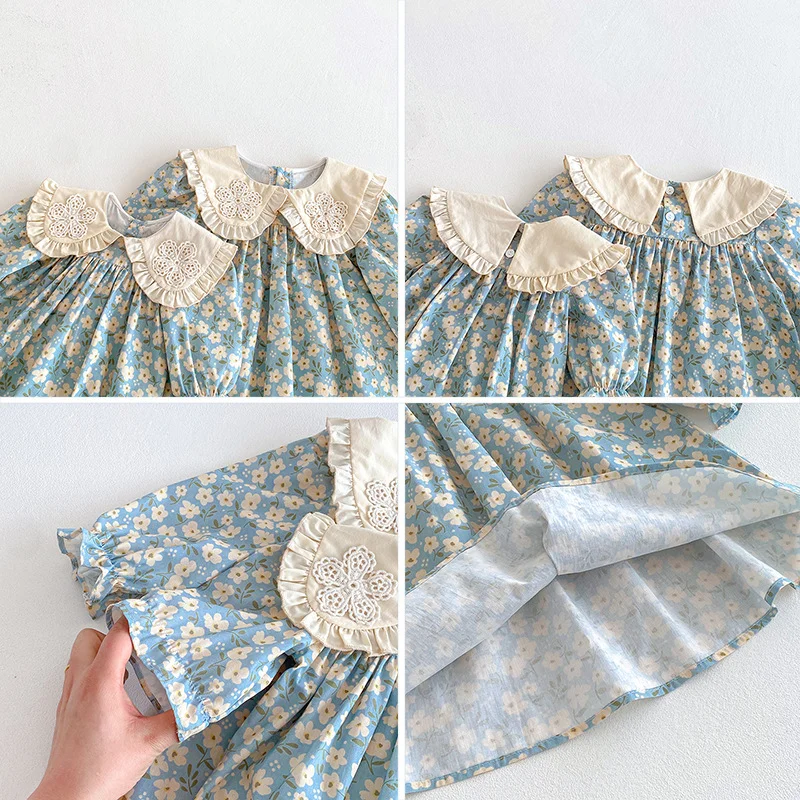 Autumn Newborn Clothes for Kids Casual Blue Flower Dress O-Neck Collar Long Sleeve Romper for Baby Girls 100% Cotton Straight