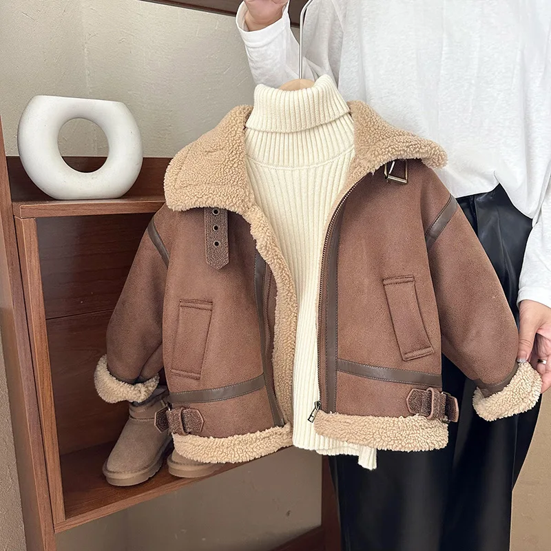 Customized Children's Fleece-lined Stand Collar Oblique Placket Autumn Fashionable Suede Fur Warm Boys Girls Clothes for Kids