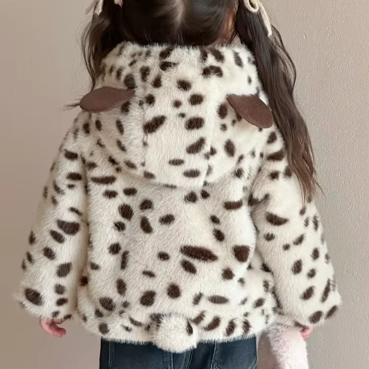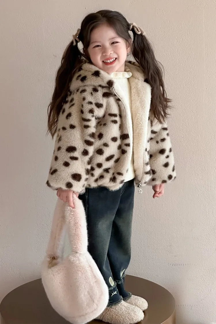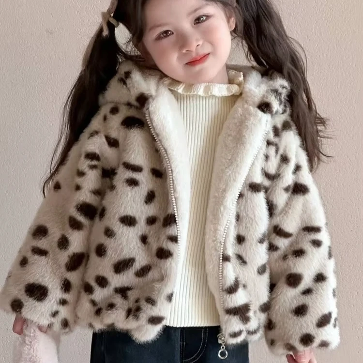 Customized Children's Thickened Winter Casual Fleece Lined Hooded Leopard Print Garment Dyed Faux Fur Clothes for Kids