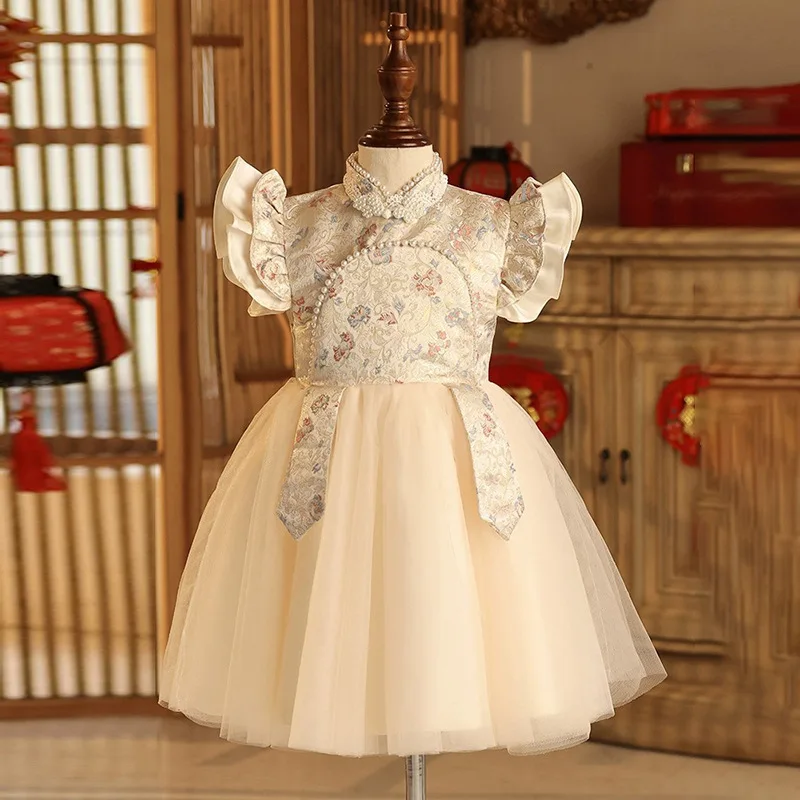 Custom Nail Bead Fluffy Toddler Evening Gown Flower Girls Dresses Children Wedding Party Chinese Style Clothes for Kids