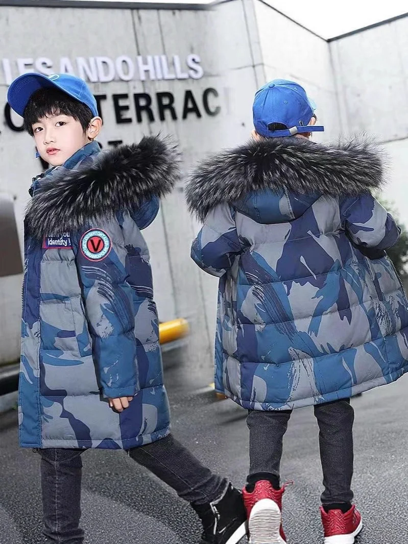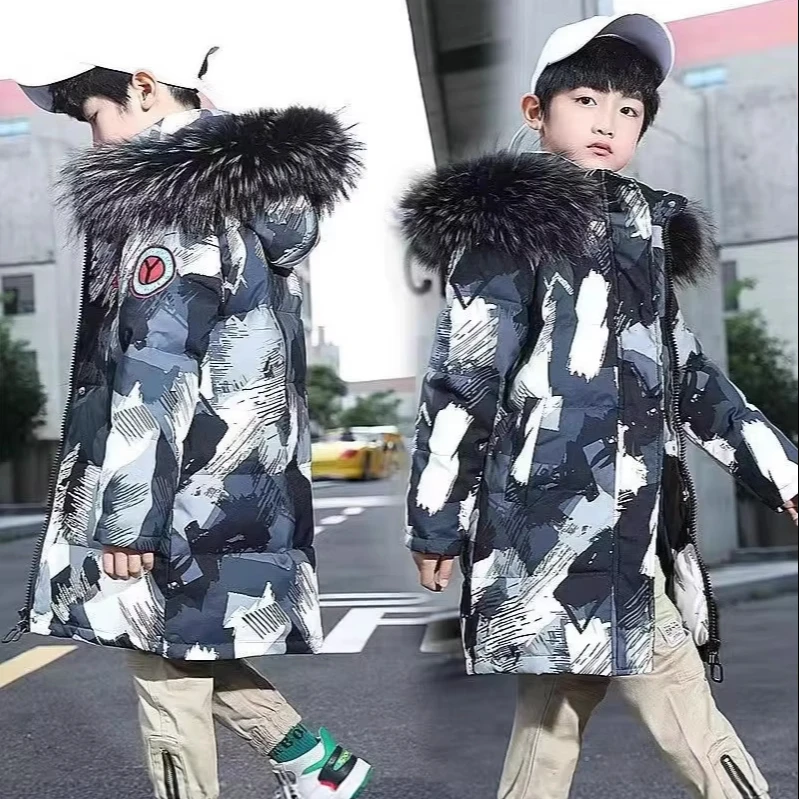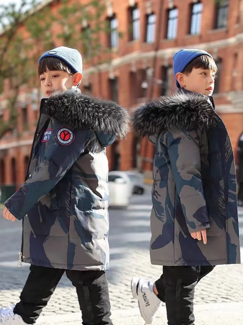Customized Children's Bomber Jacket Winter Boys' Coat Hooded Long Coat Garment Dyed Printed Camouflage Zipper Clothes for Kids