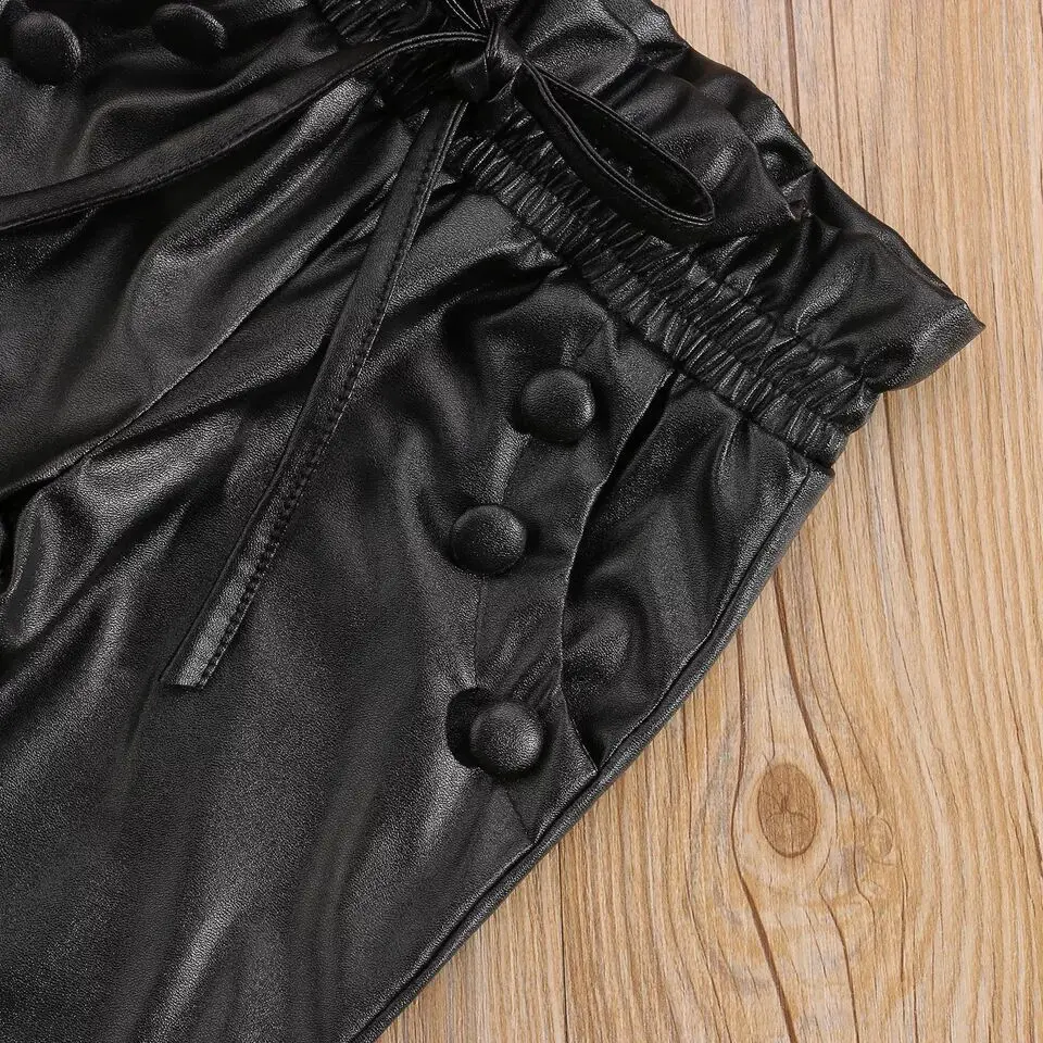 Spring Autumn Children Girls Clothes Outfit 2pcs Suit Solid Long Sleeve Pullover Tops PU Leather Pants Kid Clothing Sets