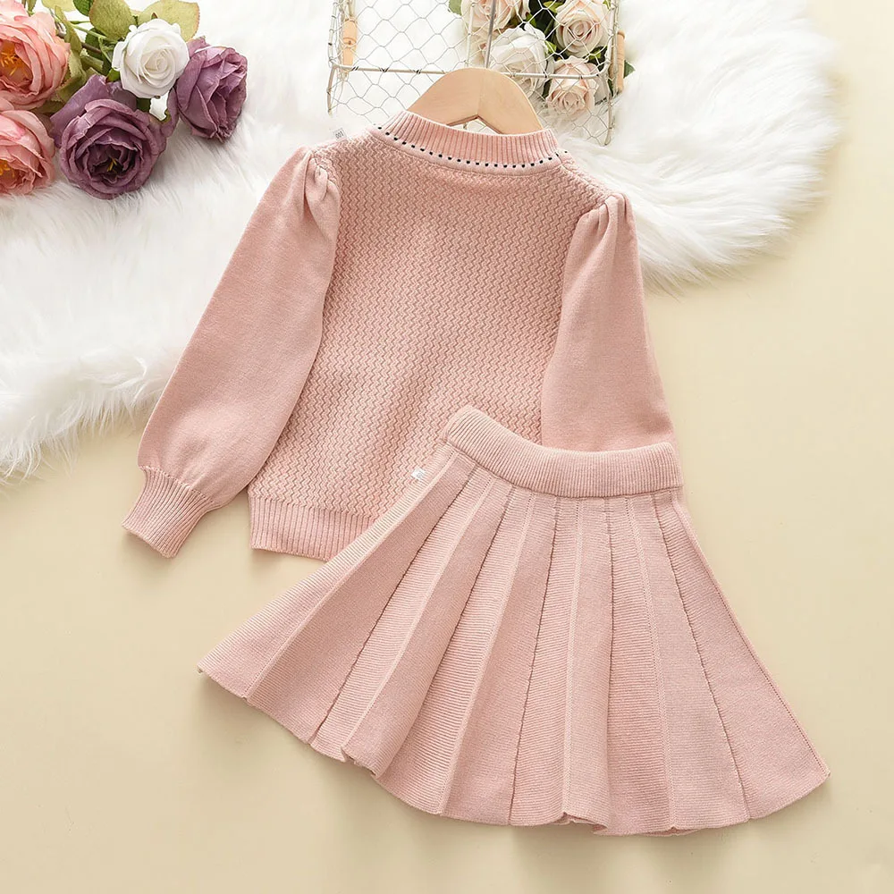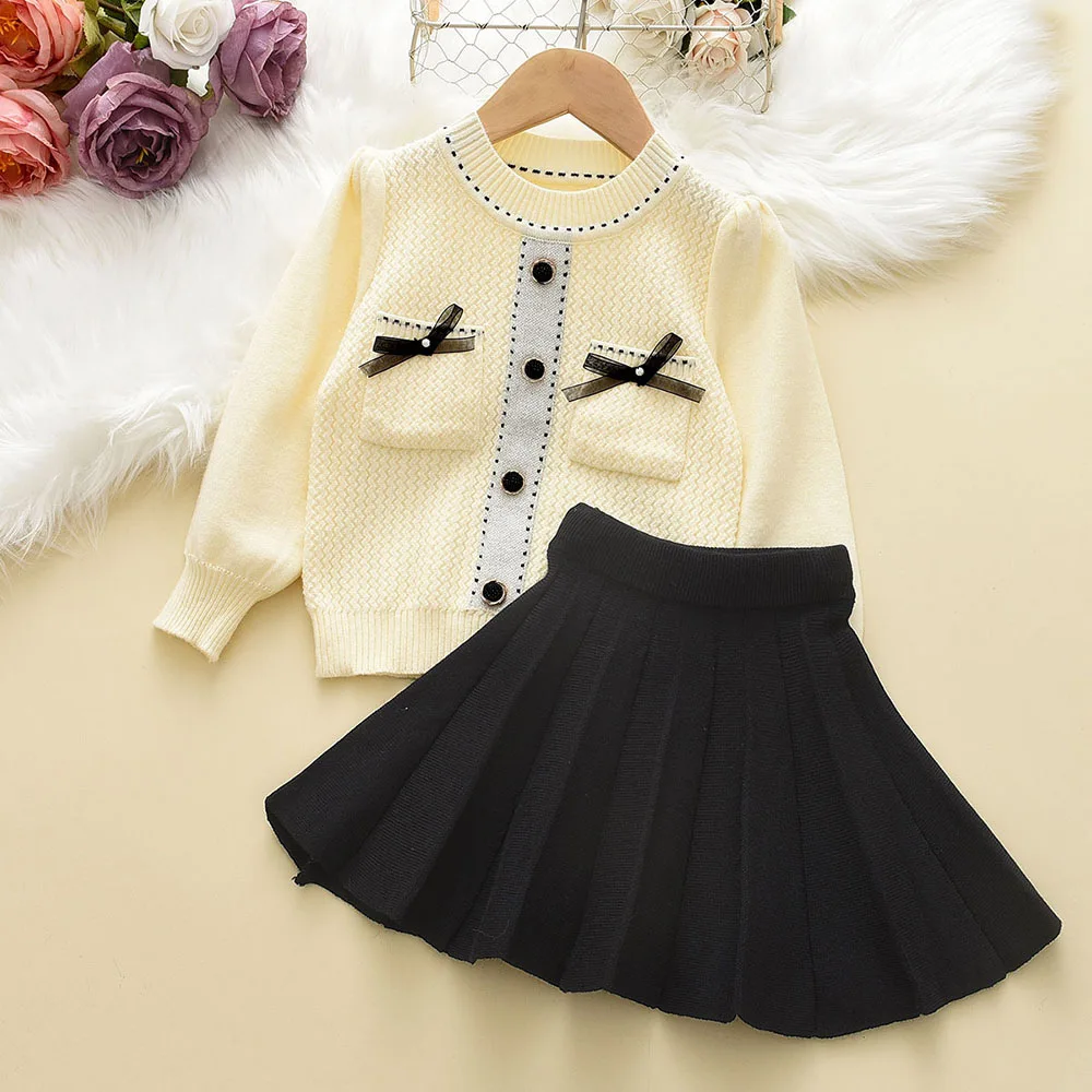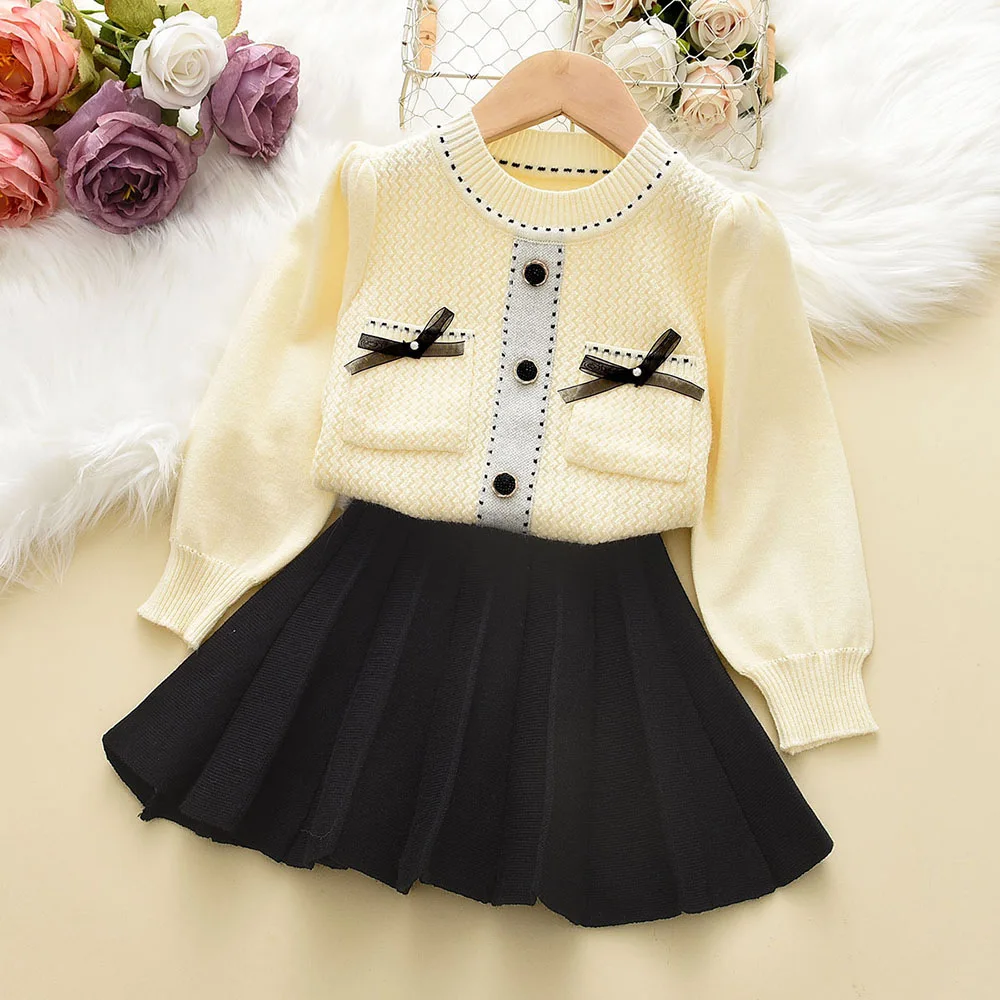 Girls Sweater Suit 2022 Autumn Winter New Long Sleeved Bow Pullover Knitted Pleated Skirt Little Girl 2PCS Outfits Kids Clothes