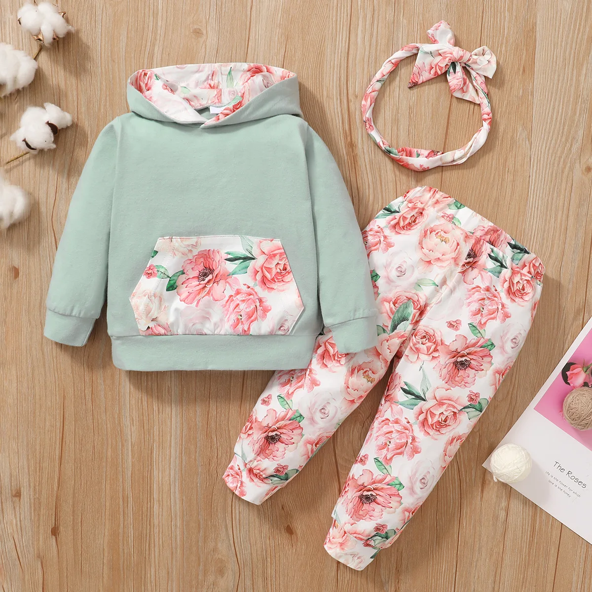4 Colors Autumn 3pcs Toddler Outfits Long Sleeve Hooded Floral Printed Pocket Tops Pants Hairband Baby Girls Clothes Sets