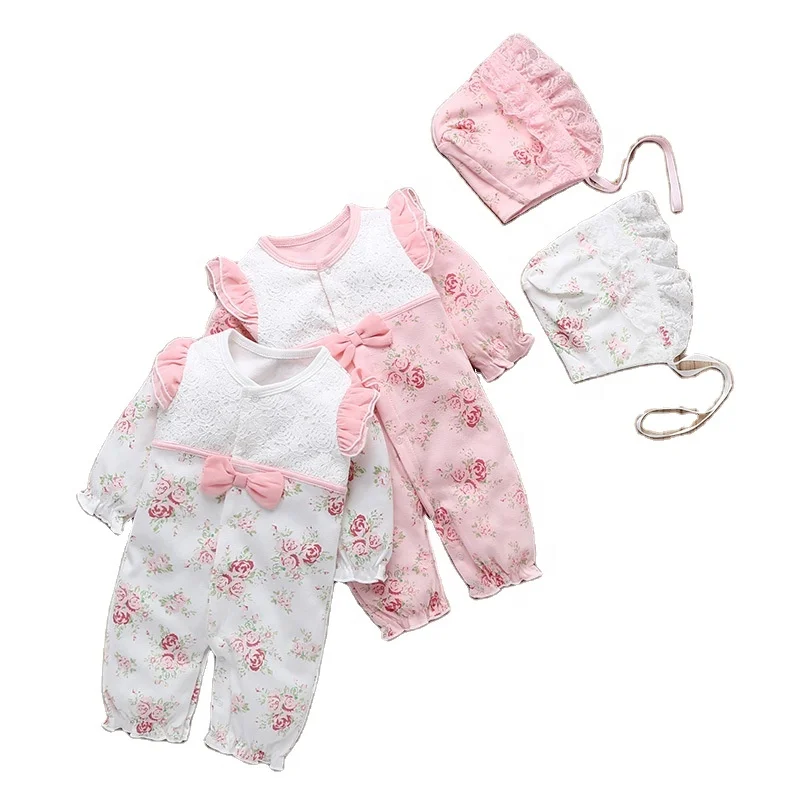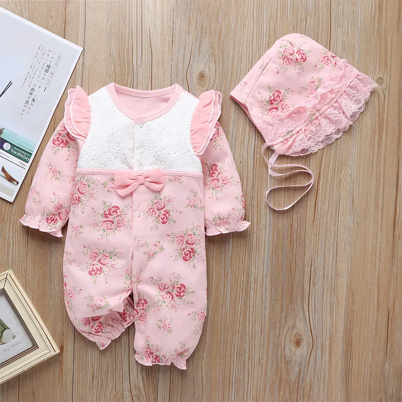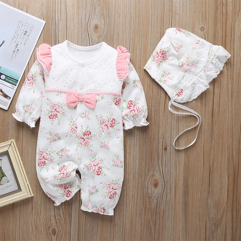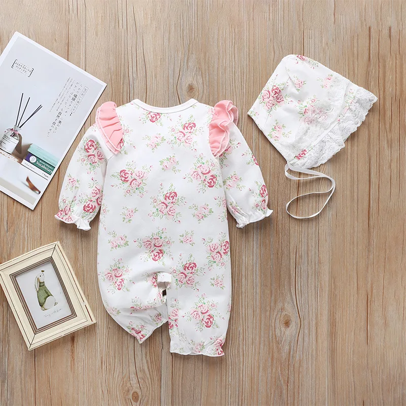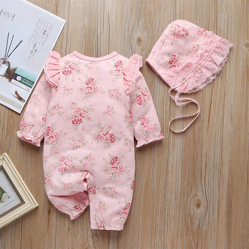 2021 Autumn Infant Baby Girls Clothes Floral Print Rompers Long Sleeve Ruffles Lace Romper Jumpsuit Hat Outfits Newborn Clothing
