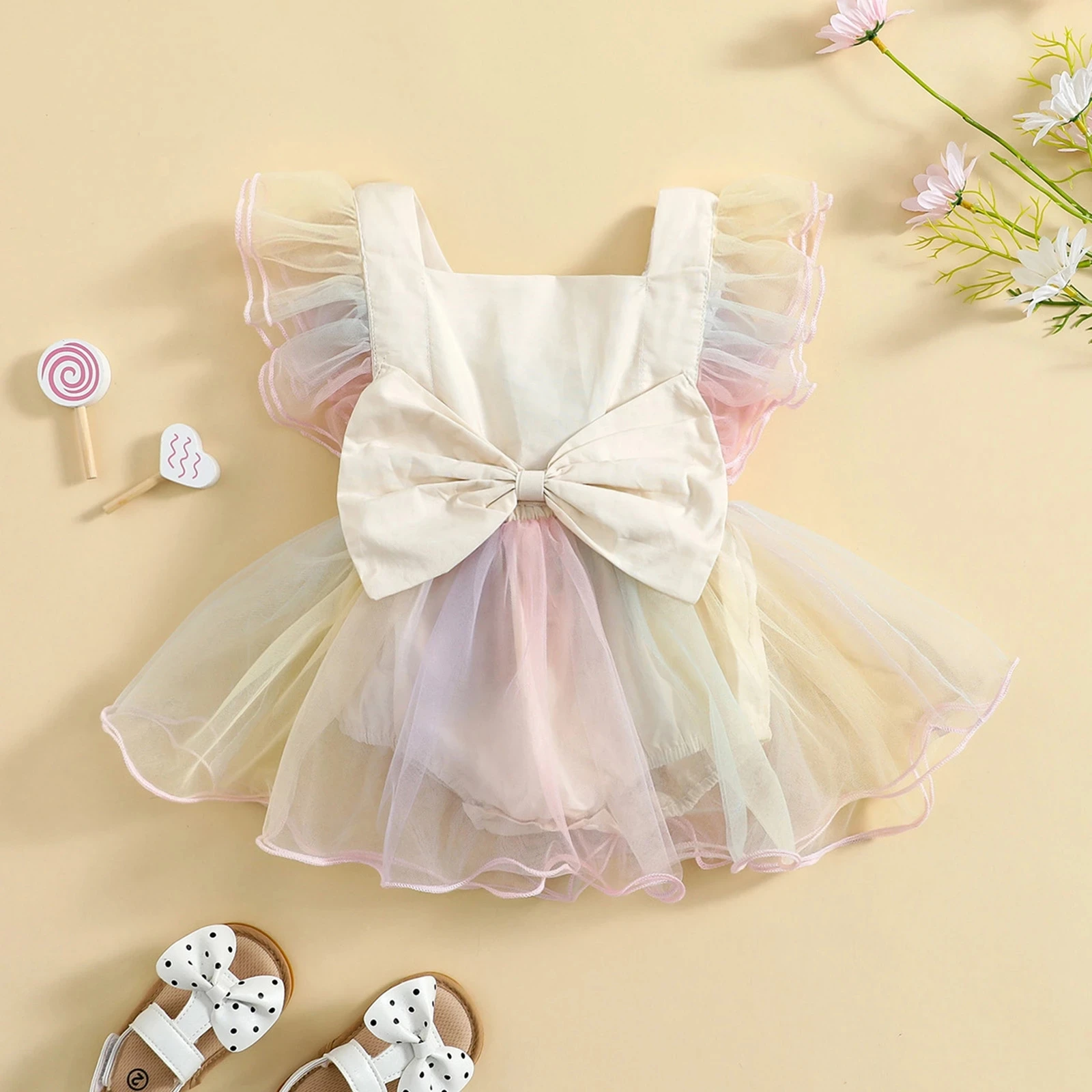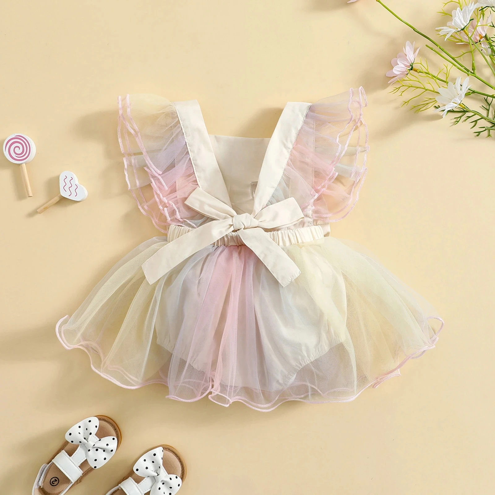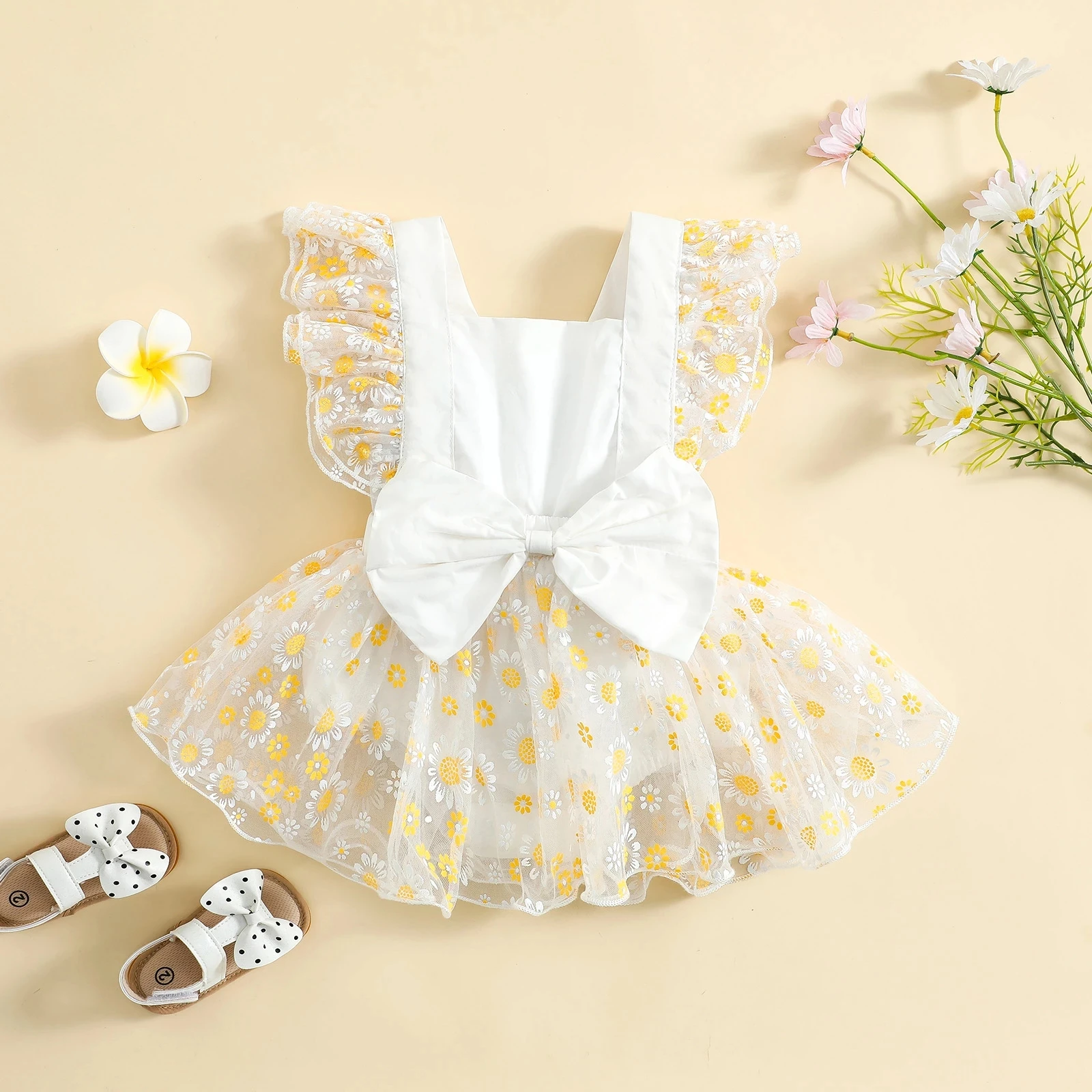 0-24M Summer Princess Toddler Girls Romper Dress Mesh Fly Sleeve Sunflowers/Tie-Dye Printed Lace Baby Tutu Jumpsuit