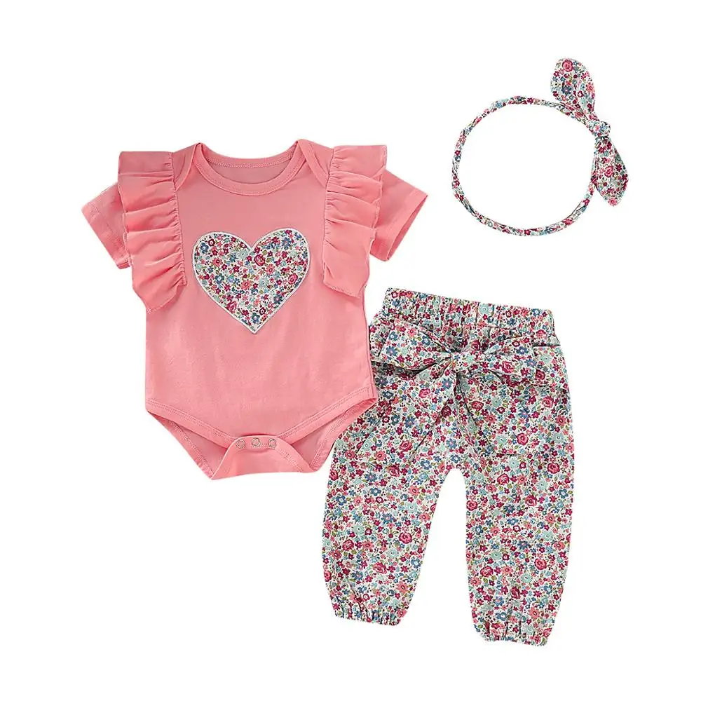 Children Romper with Floral Filled Heart Short Sleeves Big Bow Knot Flower Pants