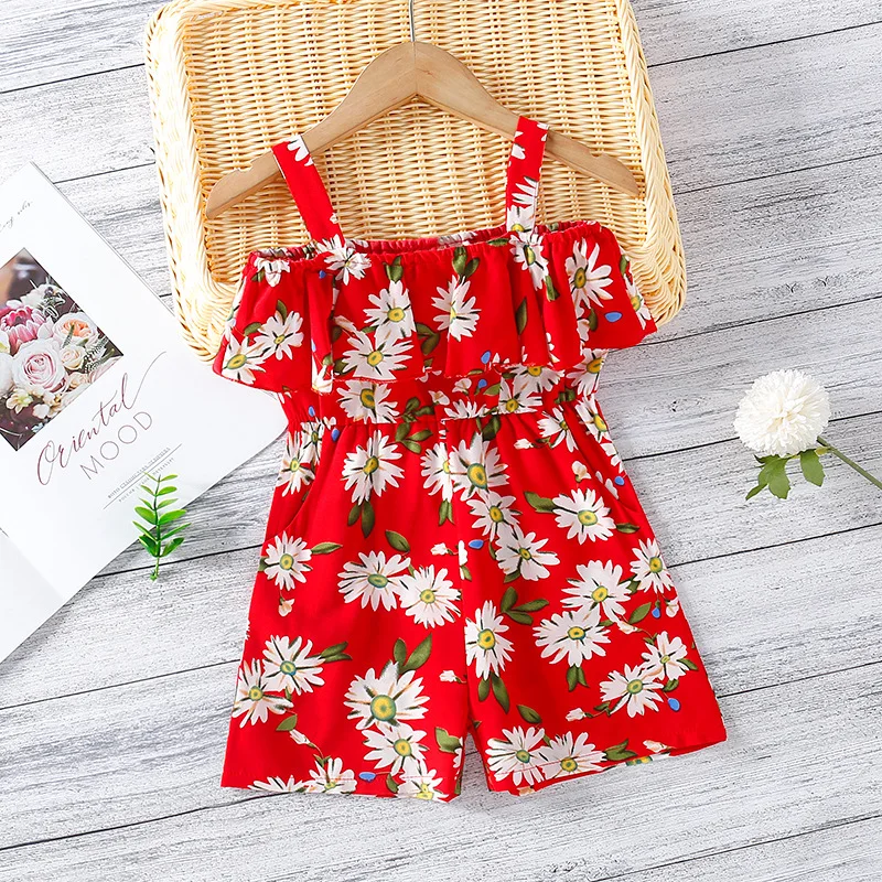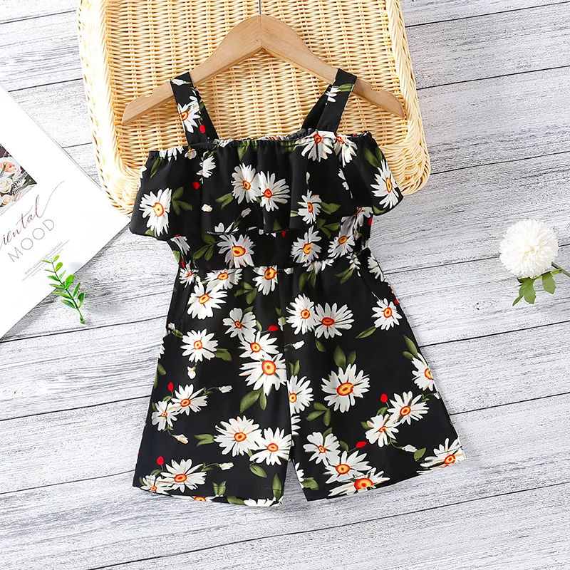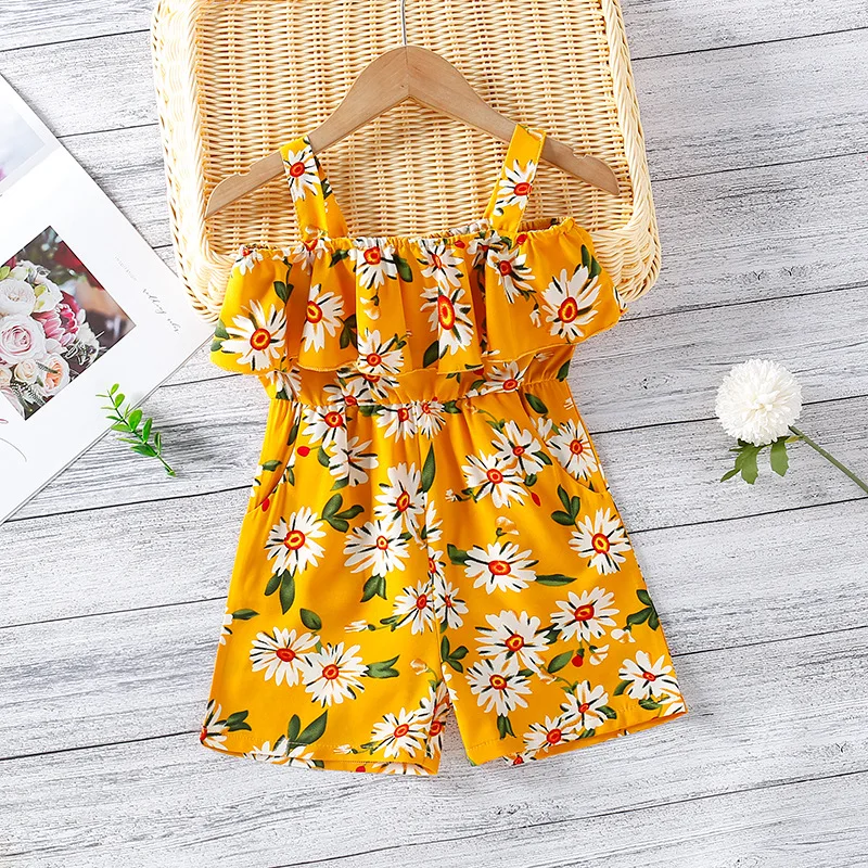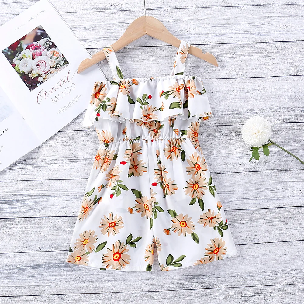 New Summer 2021 Girls Suspender Pants Print Flounce One Line Collar Leggings Shorts Kids Flower Jumpsuit