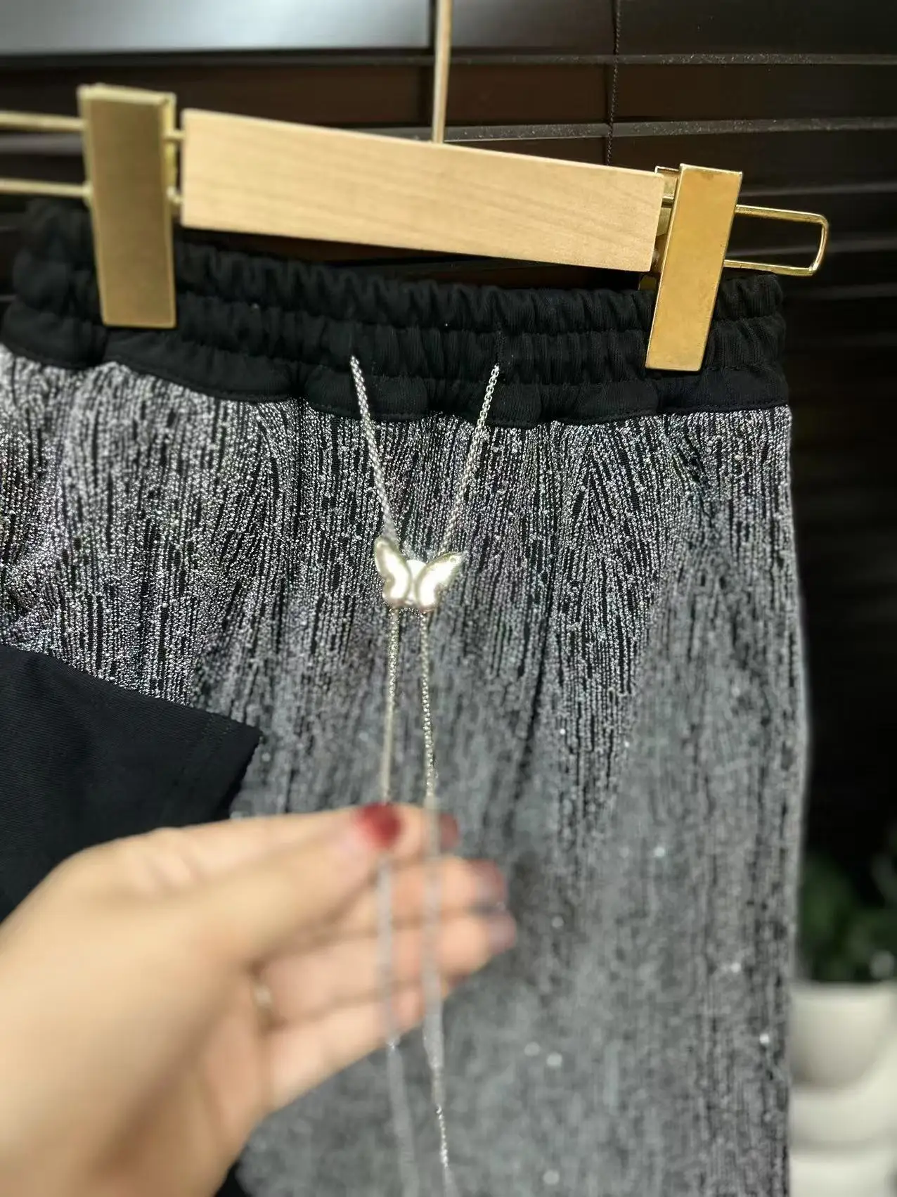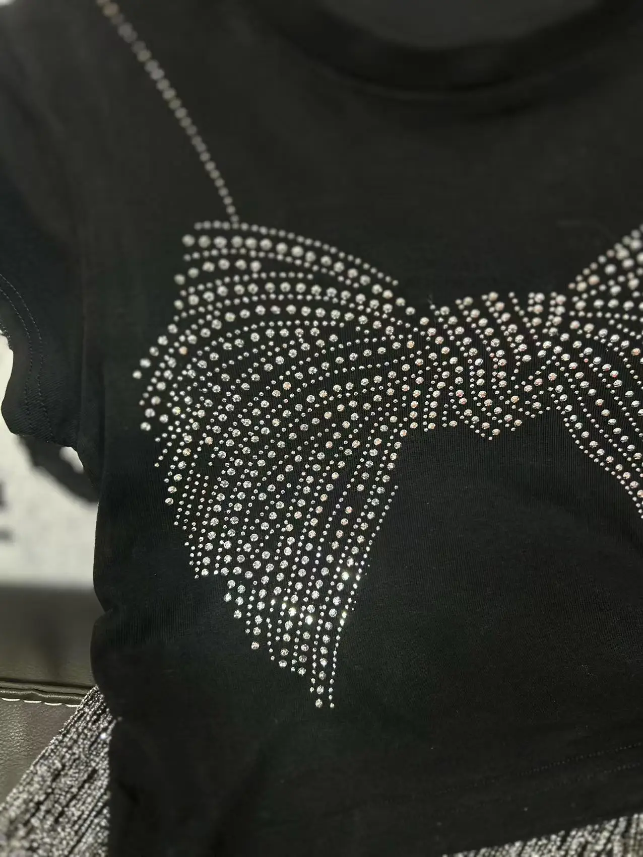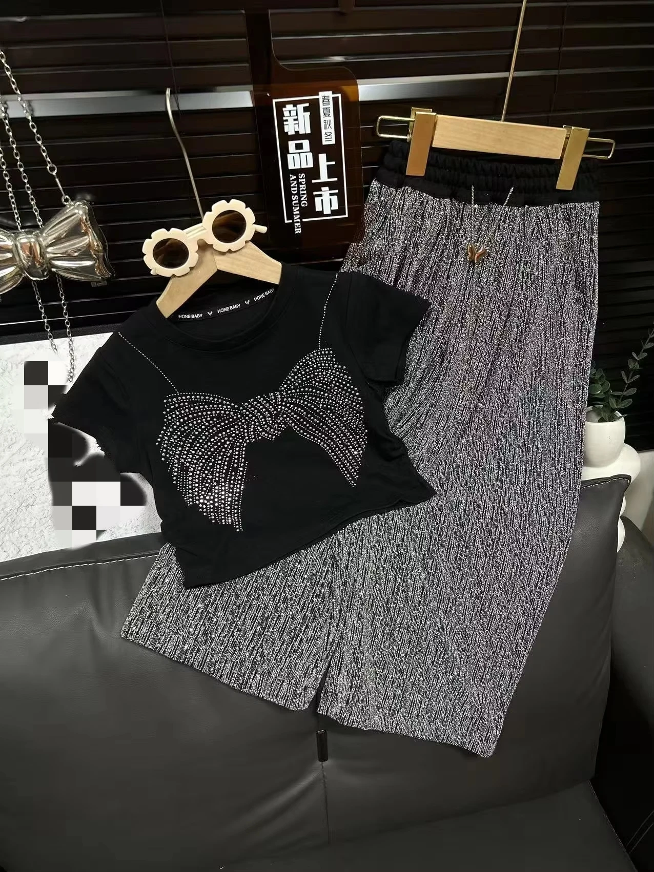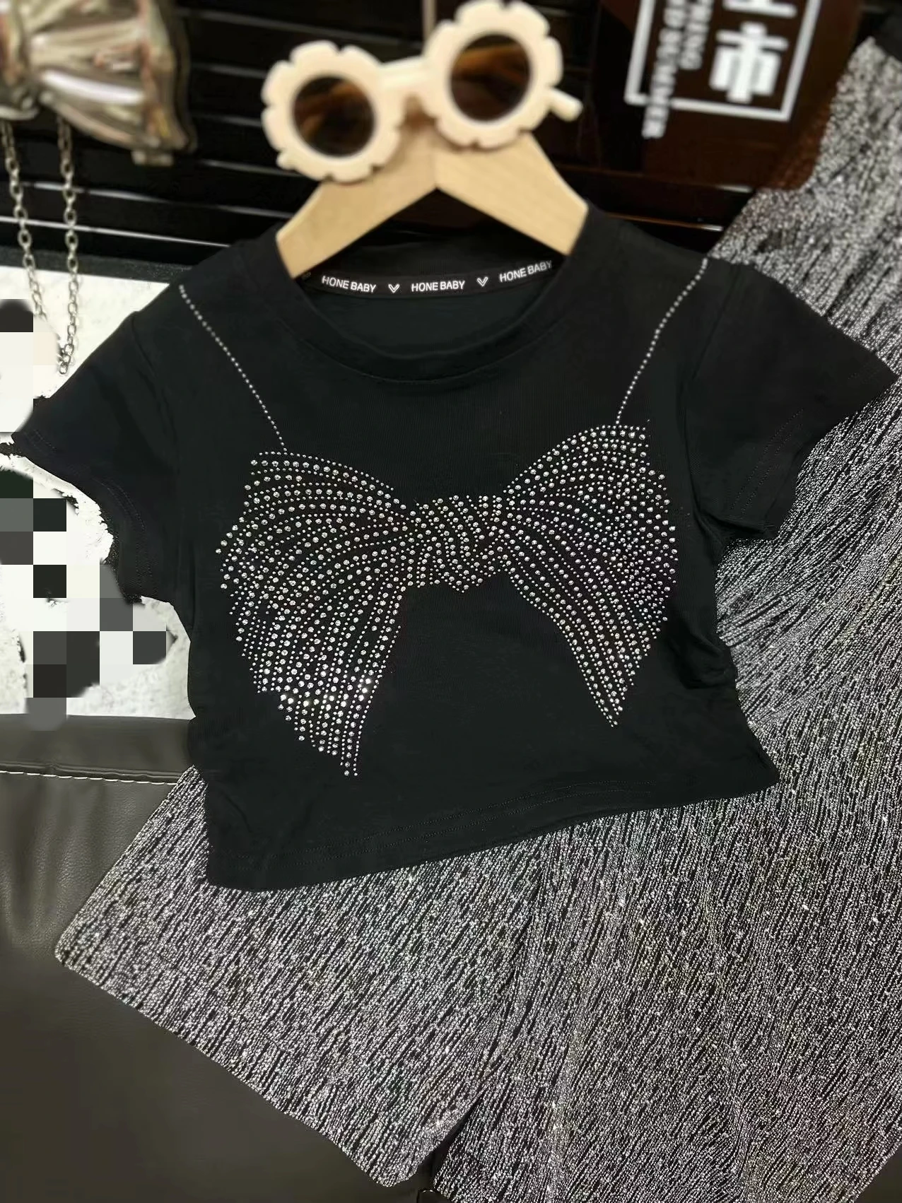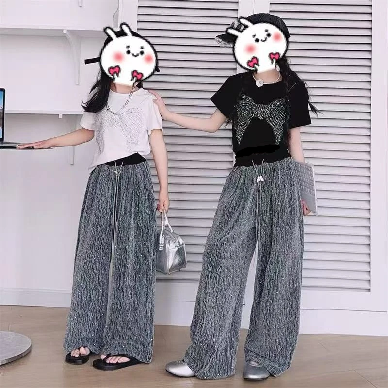 2026 Summer Children Girls Wear Short Sleeve Diamond Patterned Butterfly T Shirt Shiny Casual Pants 2Pcs Kids Set Clothing