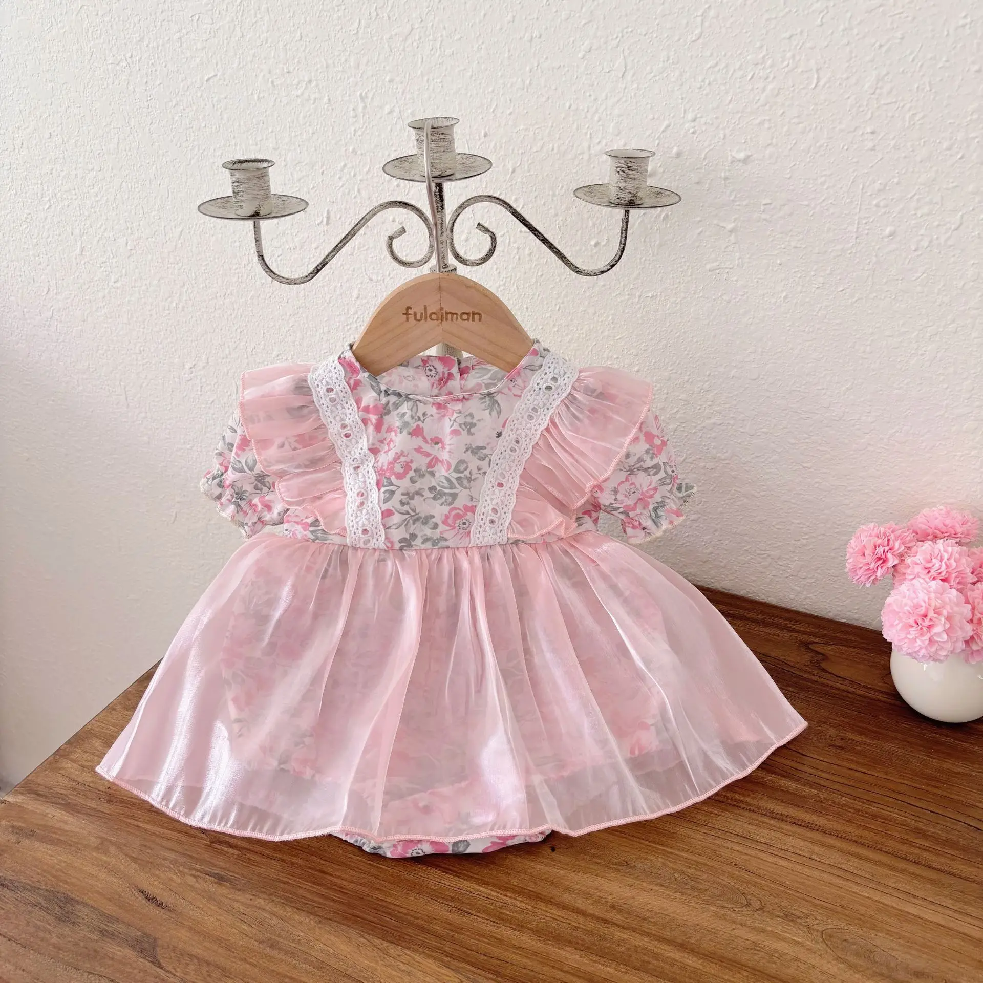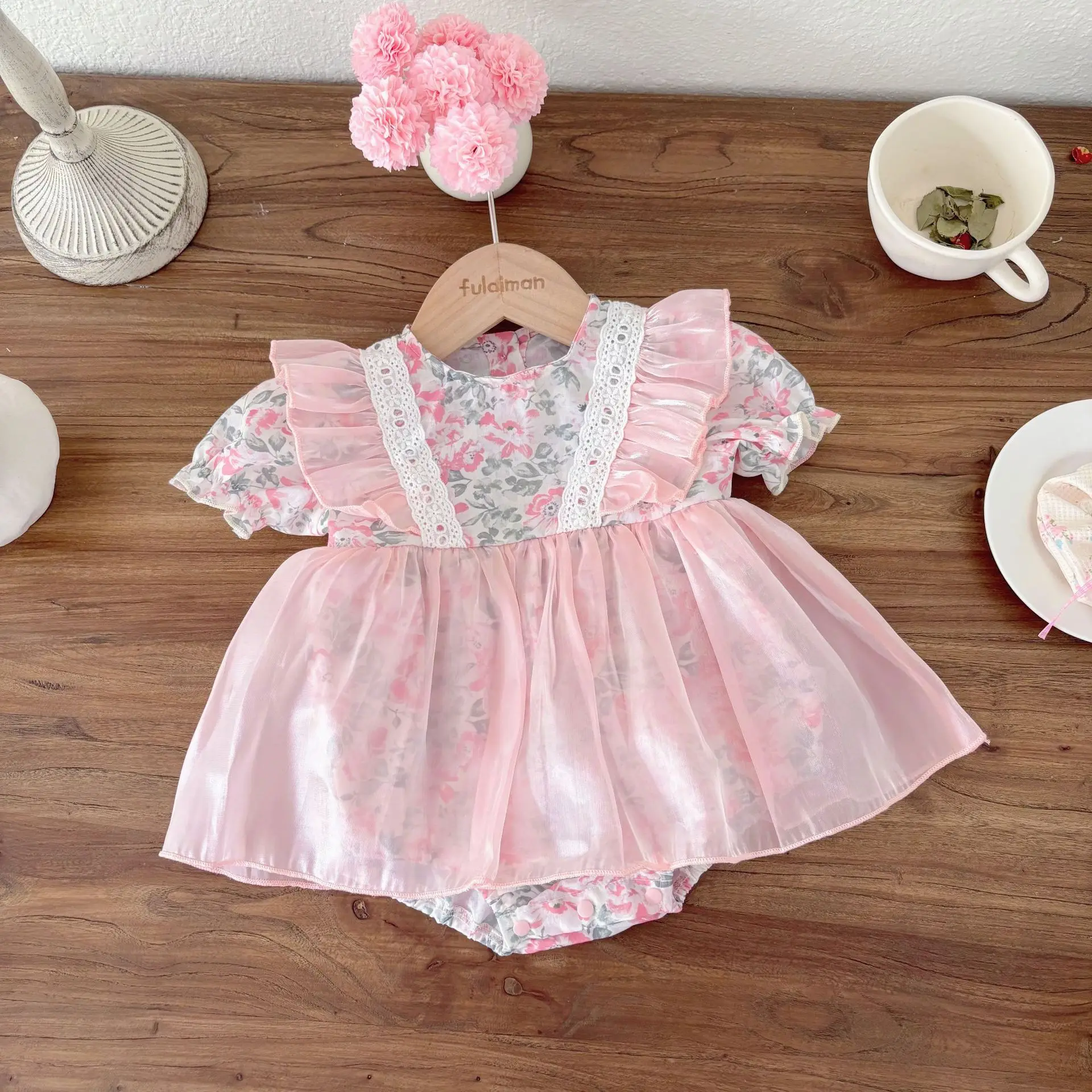 Casual Short-Sleeved Printed Lace Embroidered Dress Baby Girls Romper