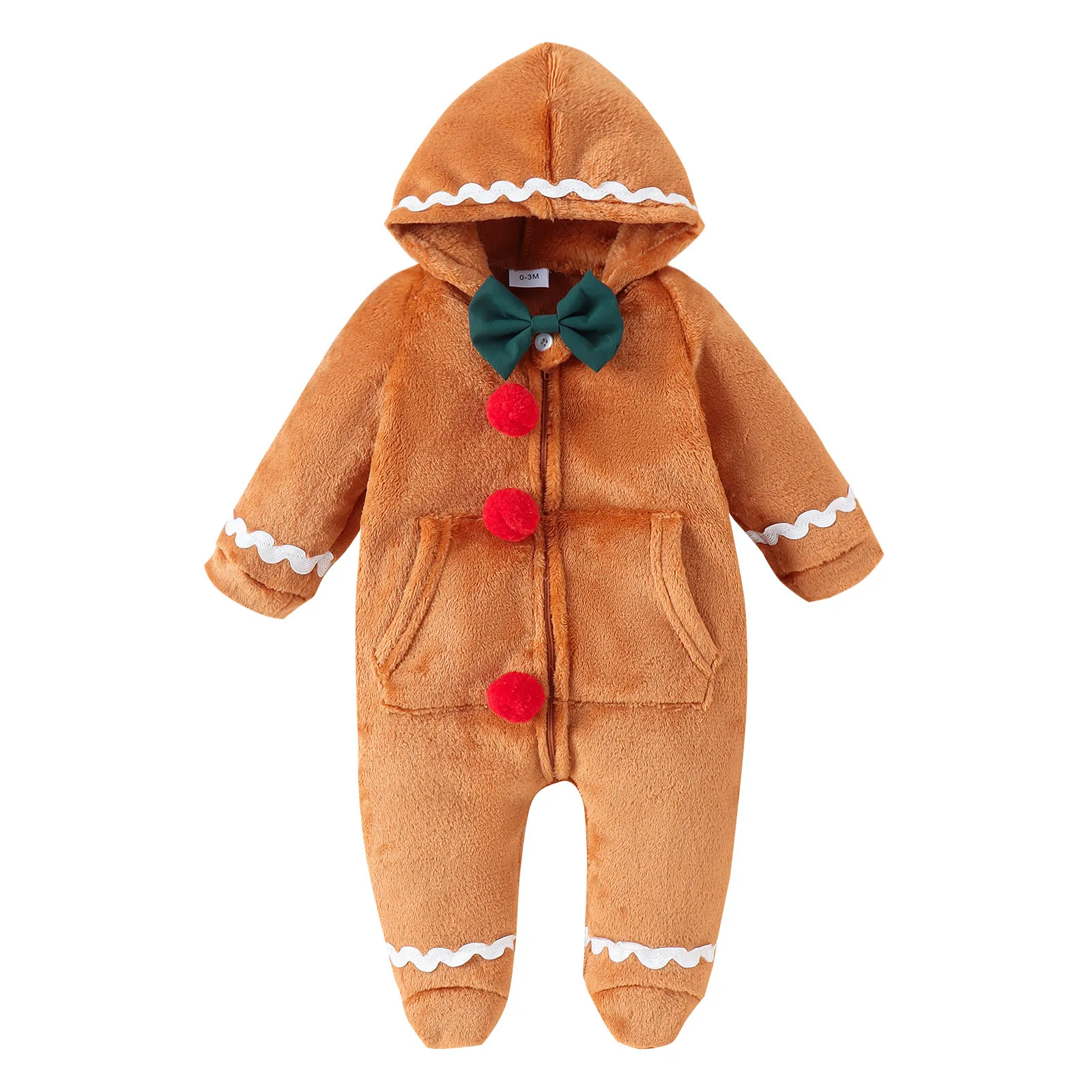 Minnie European American Children's Group Christmas Gingerbread Man Zipper Hooded Autumn Winter Warm Flannel Character Jumpsuit